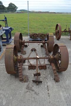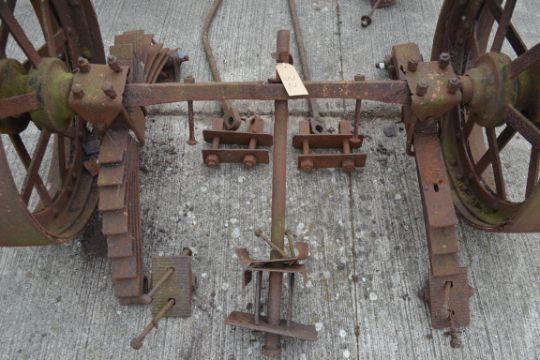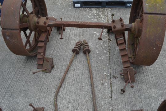 Set of four matching cast iron Foster of Lincoln steam traction wagon wheels. With axles and leaf springs.
