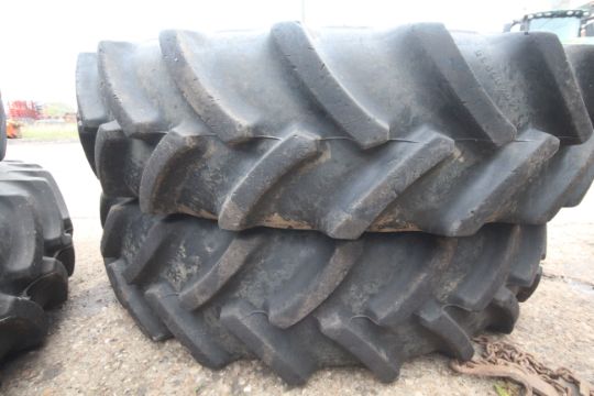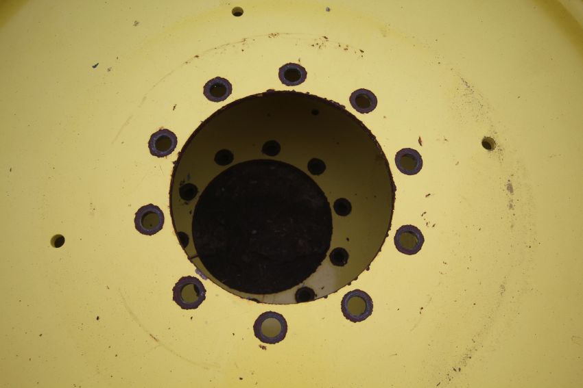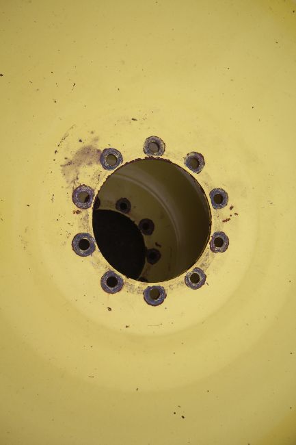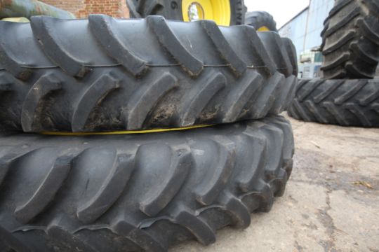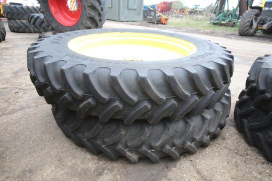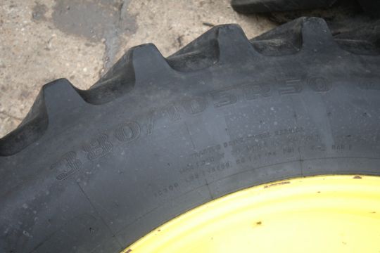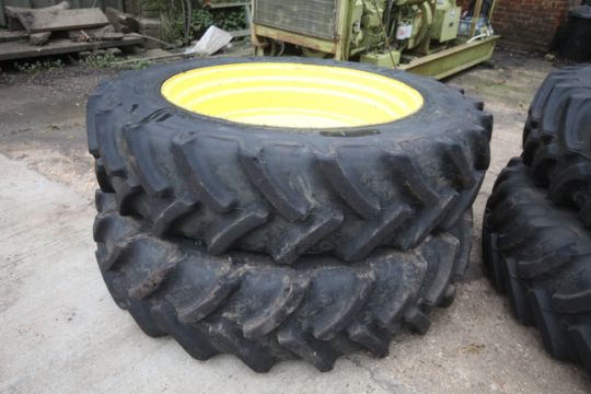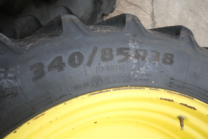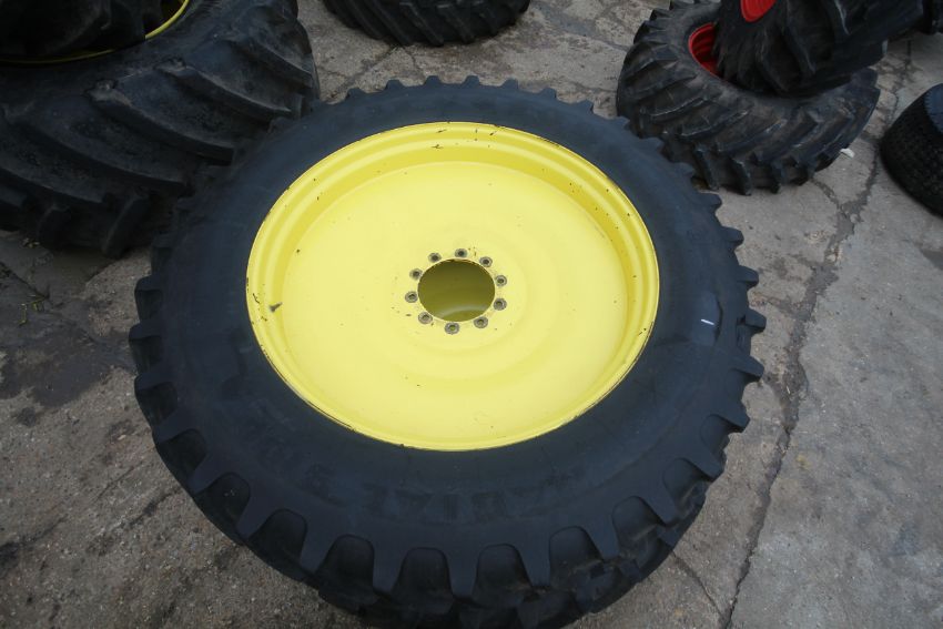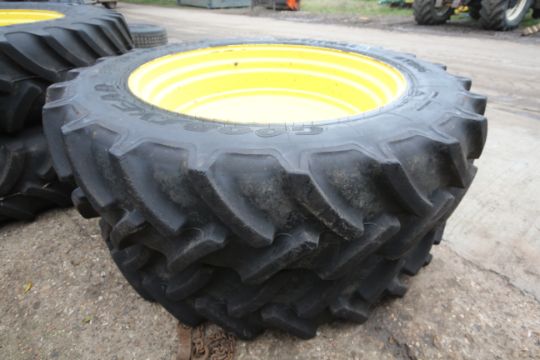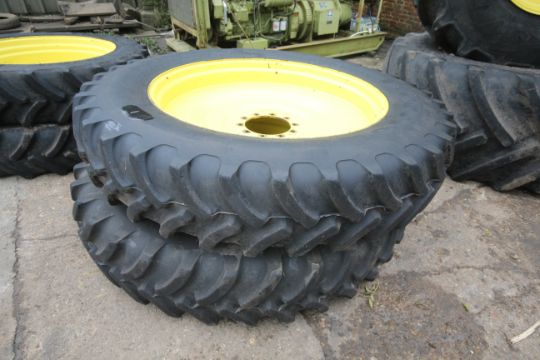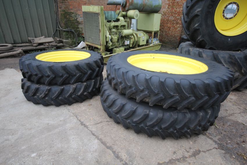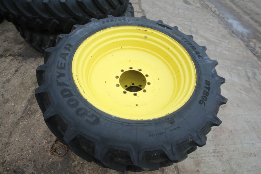 Set of John Deere row crop wheels and tyres. Comprising Goodyear 10-stud 340/85R38 fronts and Firestone 380/105R50 10-stud rears. To fit 6250R. V