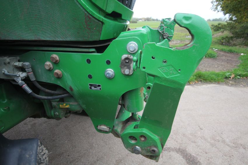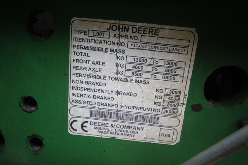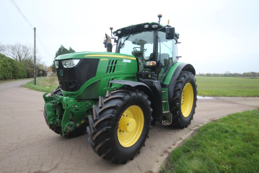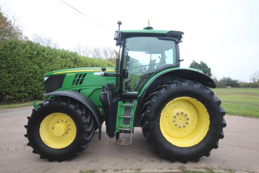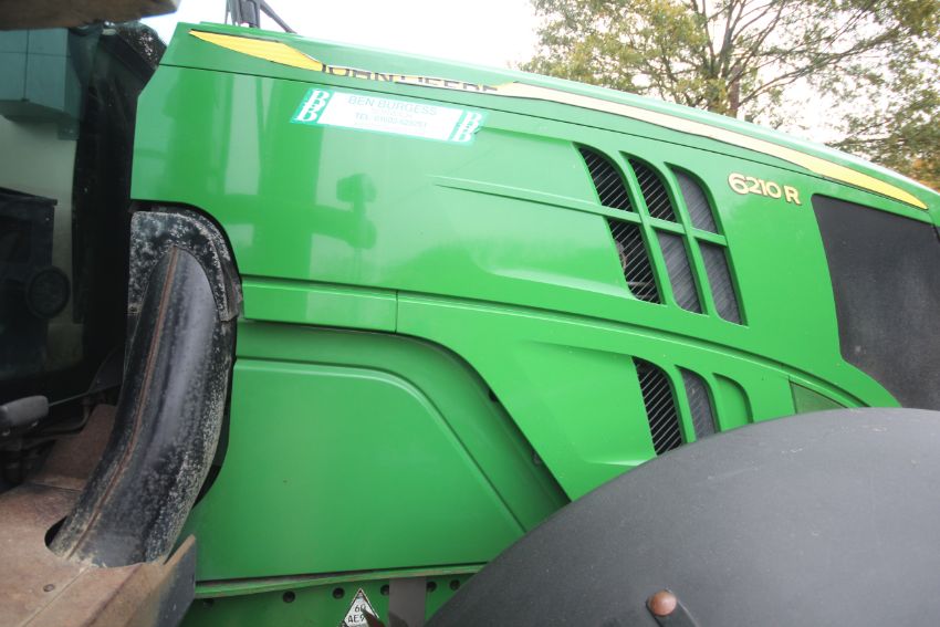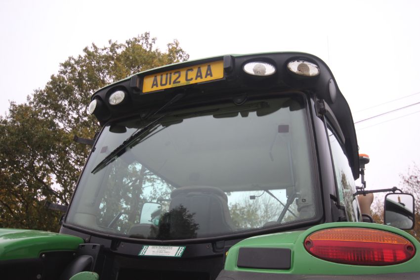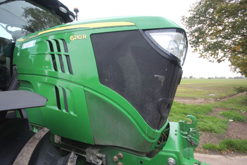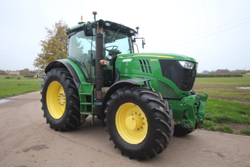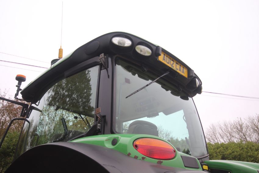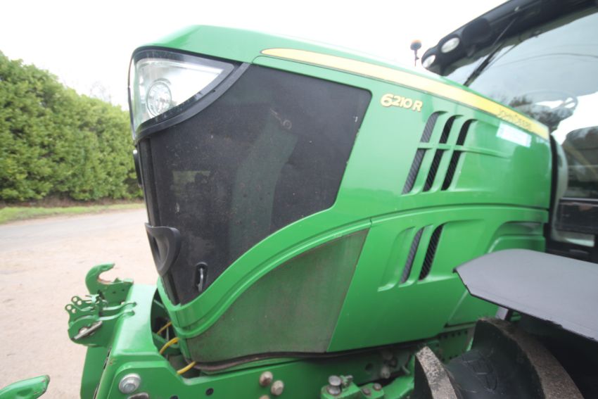 John Deere 6210R 4WD tractor. Registration AU12 CAA. Date of first registration 12/04/2012. Serial number LO6210RECN710847. 10,000 hours. With front linkage, 50 KPH Auto Quad gearbox, air brakes, front suspension, and cab suspension. V