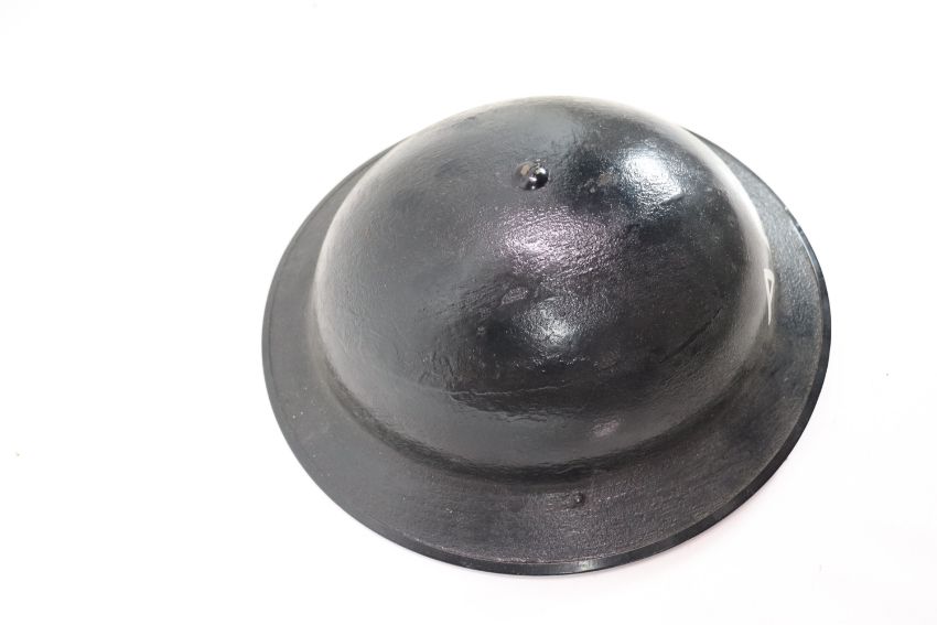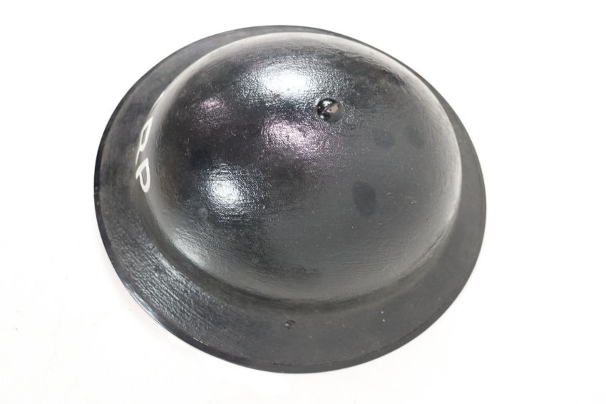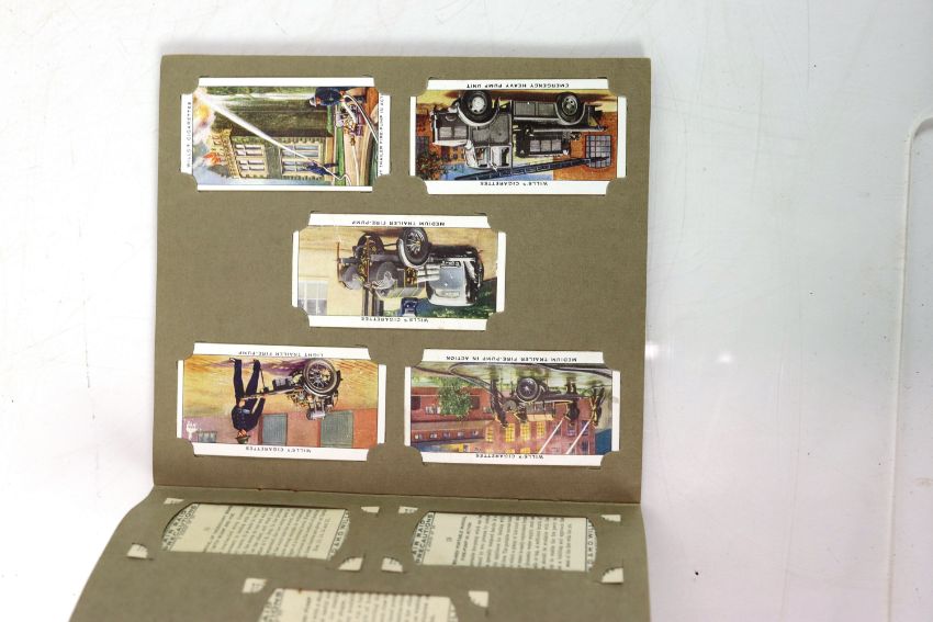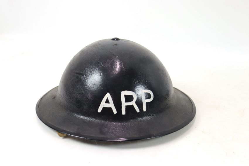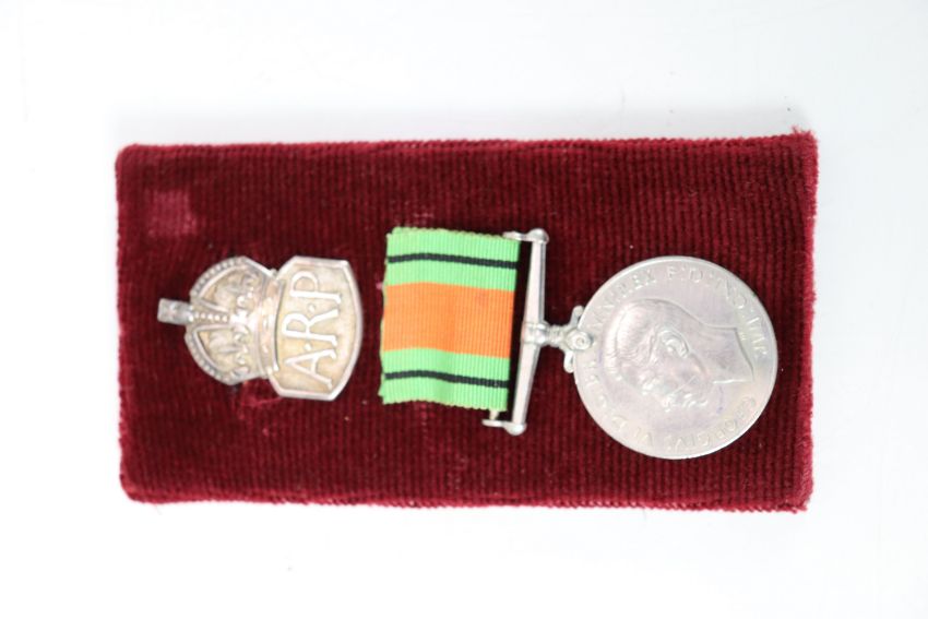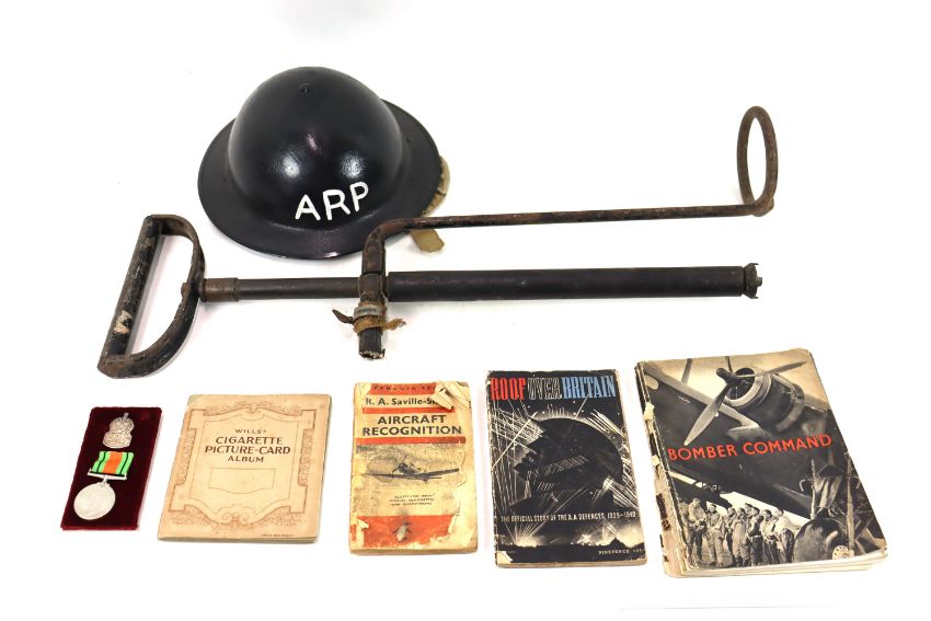 A mixed A.R.P. interest lot including silver A.R.P. badge with Defence medal, full set of 50 Wills "Air Raid Precautions" cigarette cards, helmet and stirrup pump
