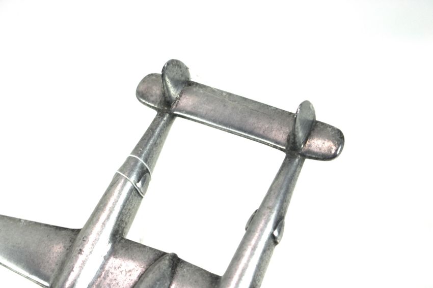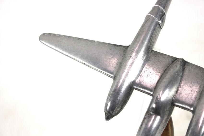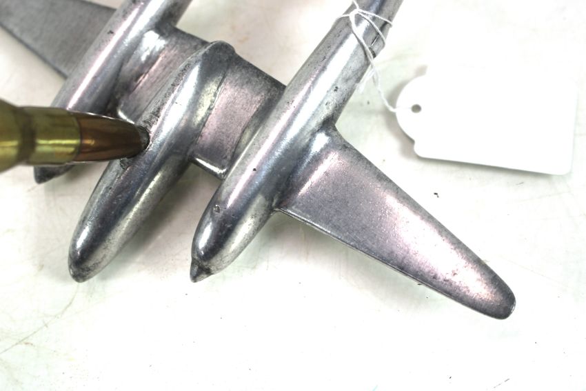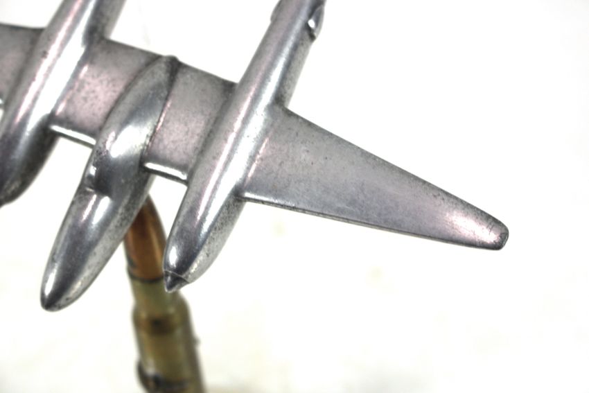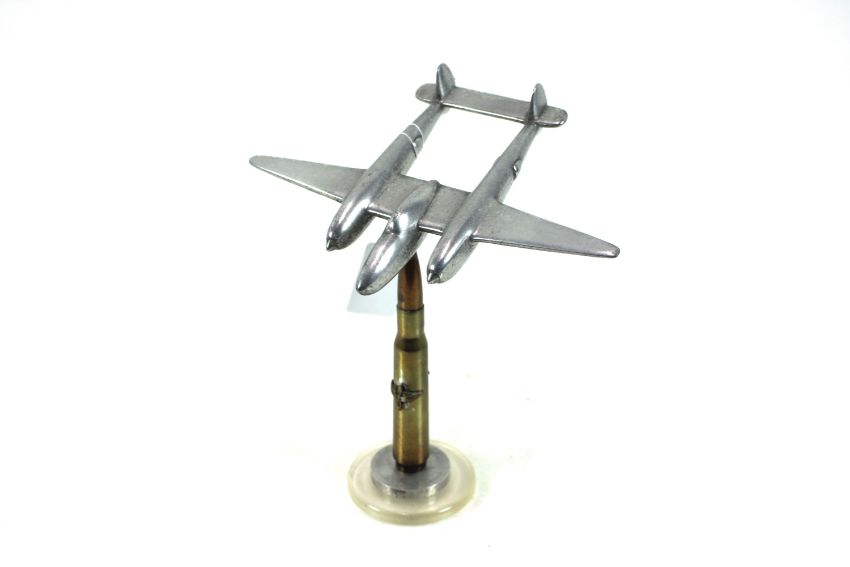 A P38 lightning model mounted on a 1944 dated 20mm inert round, which in turn is mounted on a Perspex base