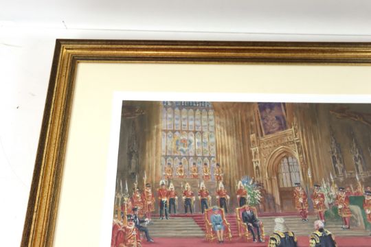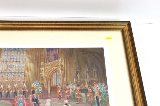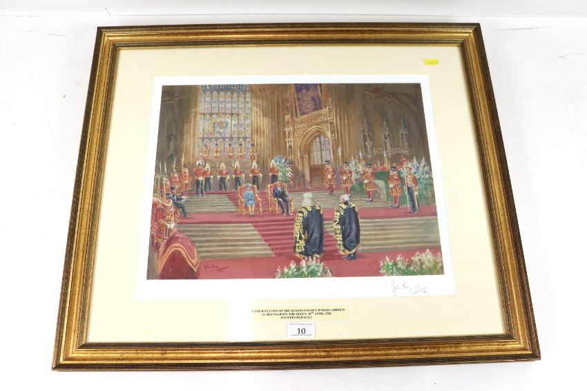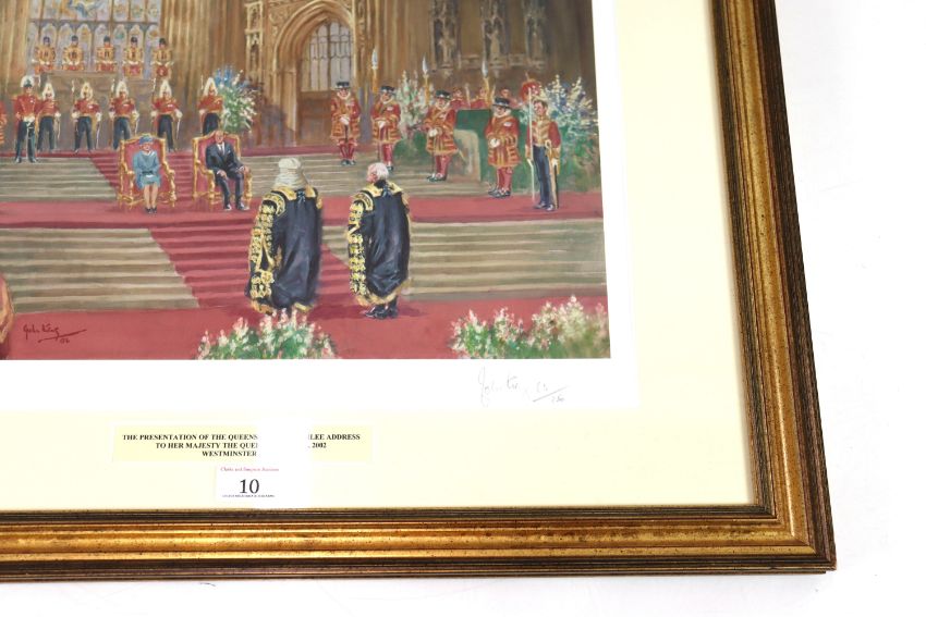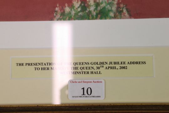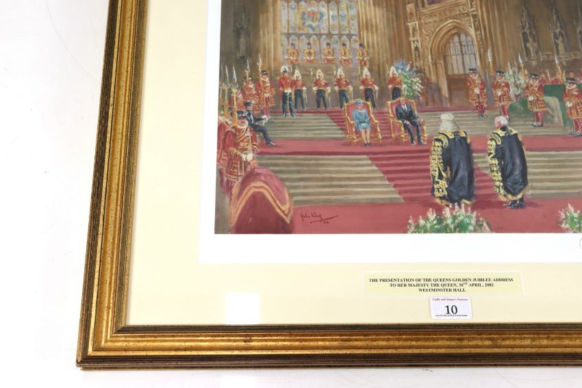 A John King signed limited edition print (65/150) "The Presentation of the Queens Golden Jubilee address to Her Majesty The Queen, 30th April 2002, Westminster Hall", framed and glazed, approx. 22½" x 26½"