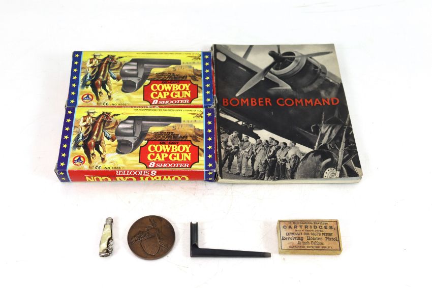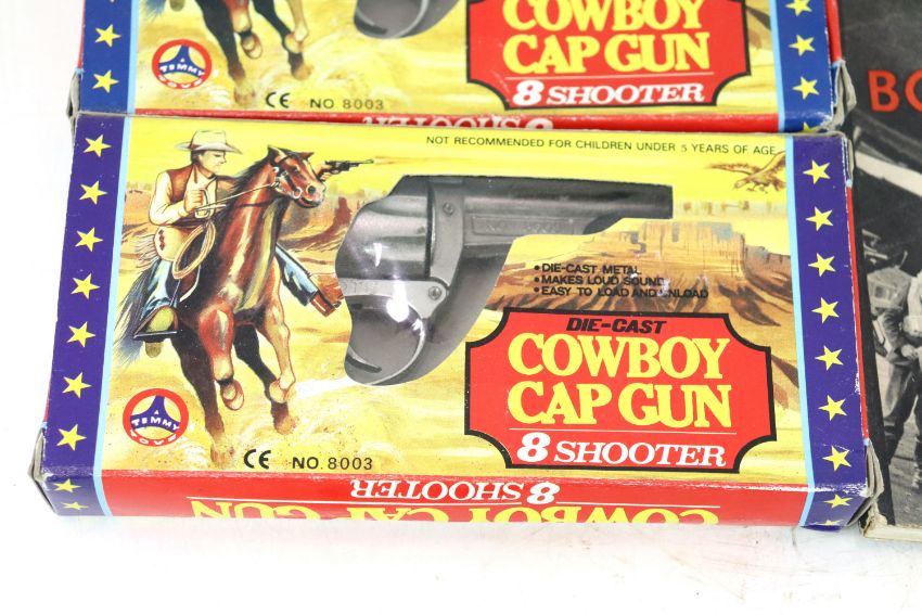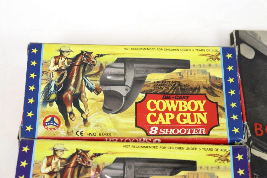 A mixed lot including two boxed toy cap guns and a modern Colt nipple key