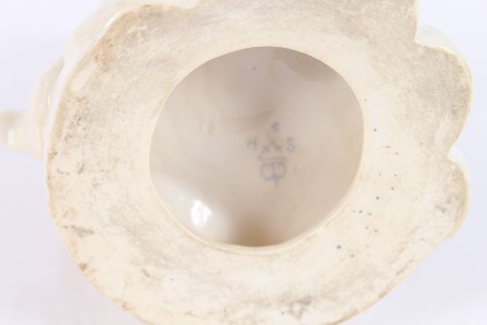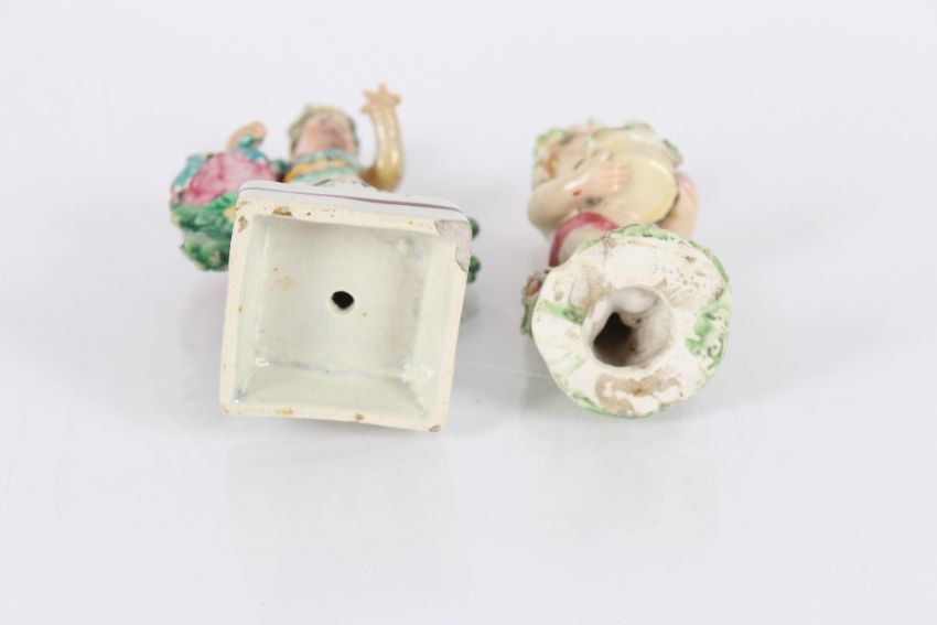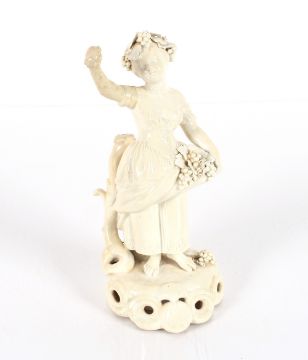 A blanc de china figure by Sampson & Hancock, study of a lady grape seller; a pearl ware figure of Putti with basket of flowers; another similar porcelain figure and a blanc de chine candle snuffer in the form of a lady in Welsh costume