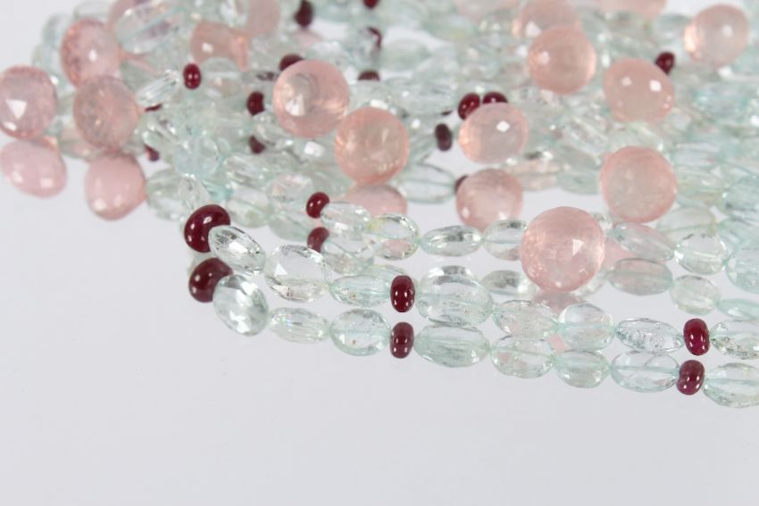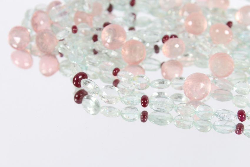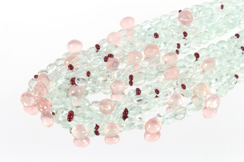 An unusual hardstone and semi-precious stone multi strand necklace, set to a spherical yellow and white stone encrusted clasp