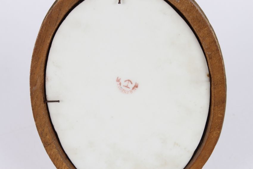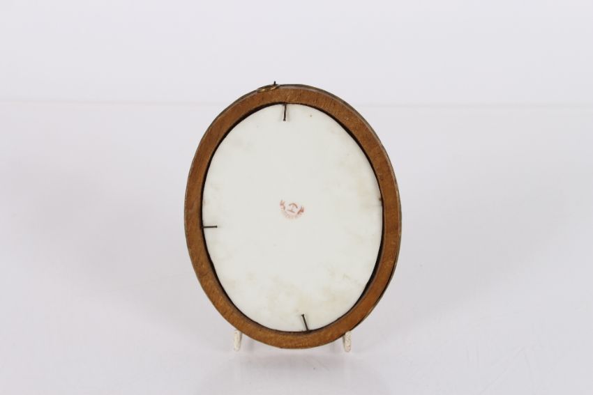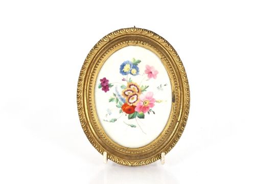 A 19th Century oval Davenport porcelain plaque, decorated flowers in gilt frame, 15cm  x12.5cm overall