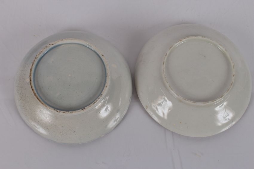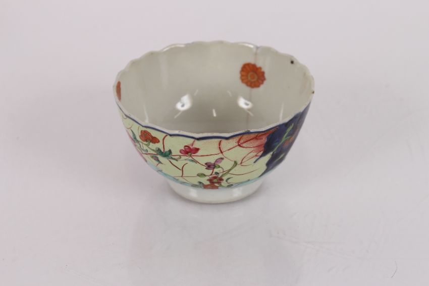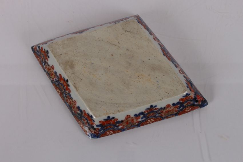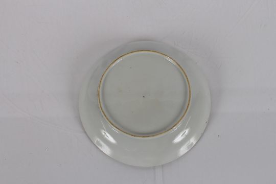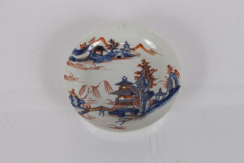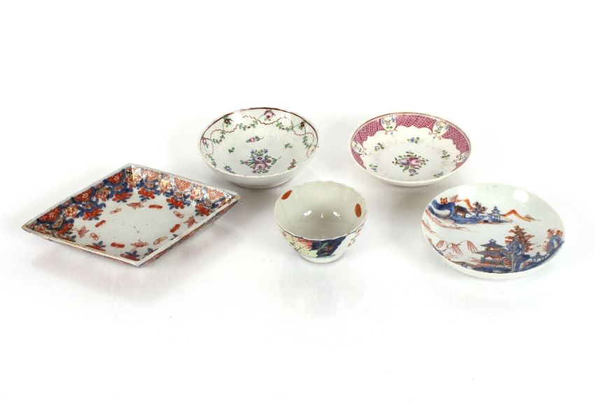A Chinese tea bowl, with tobacco leaf decoration; an Oriental saucer dish; a Newhall similar; a pearl ware saucer dish with foliate spray painted decoration; and an Imari pattern lozenge shaped dish