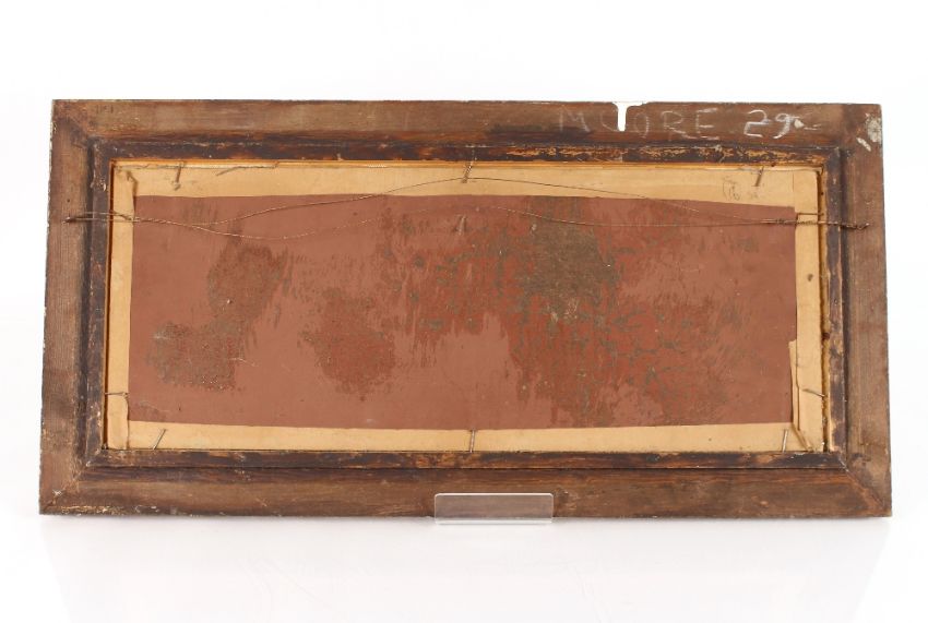 John Moore, study of a beached ship at sunset, signed oil on canvas, 23.5cm x 60cm