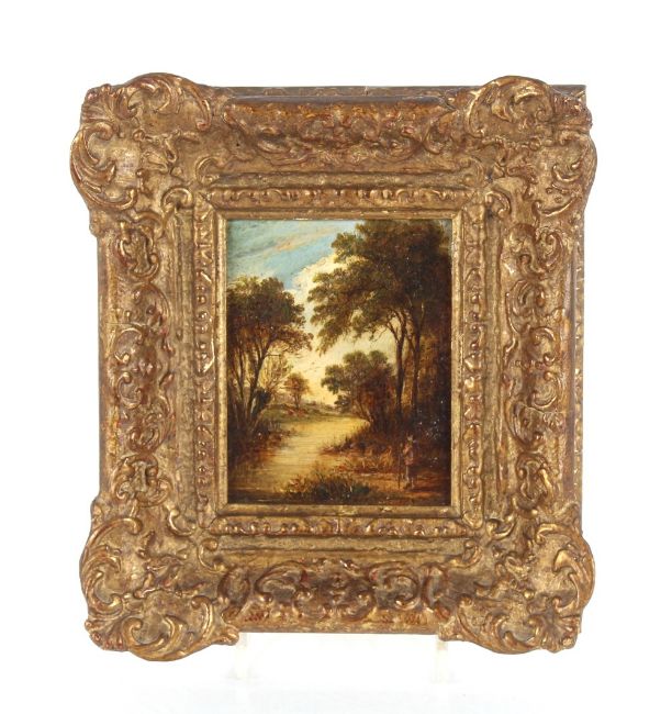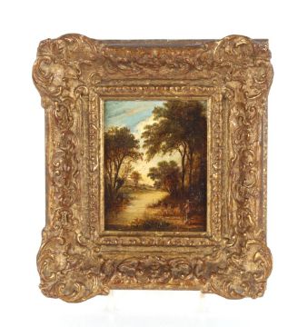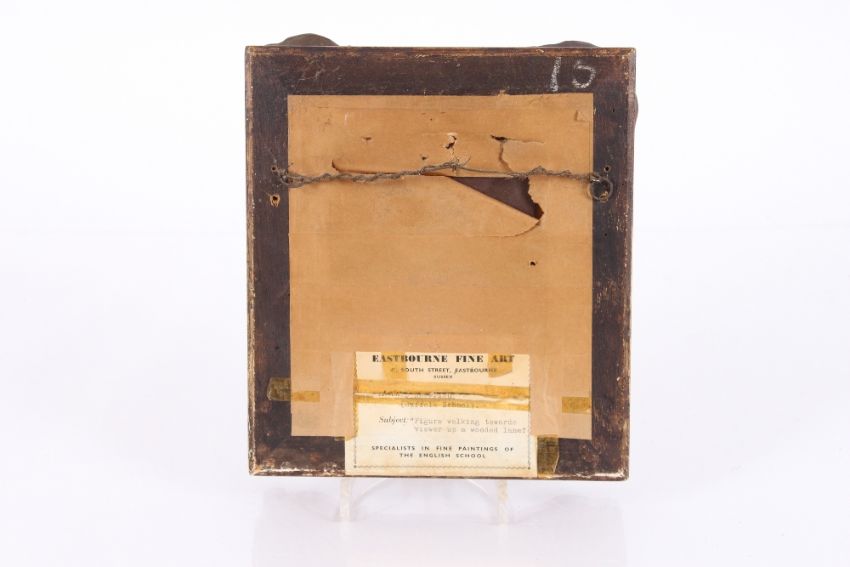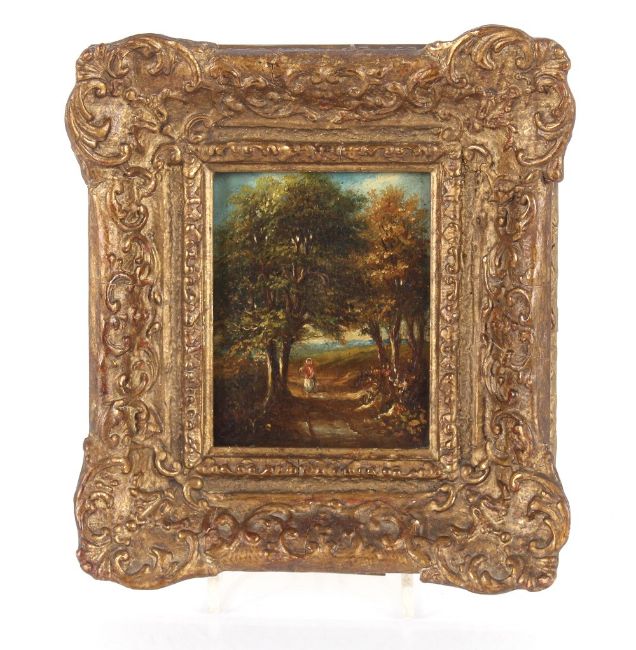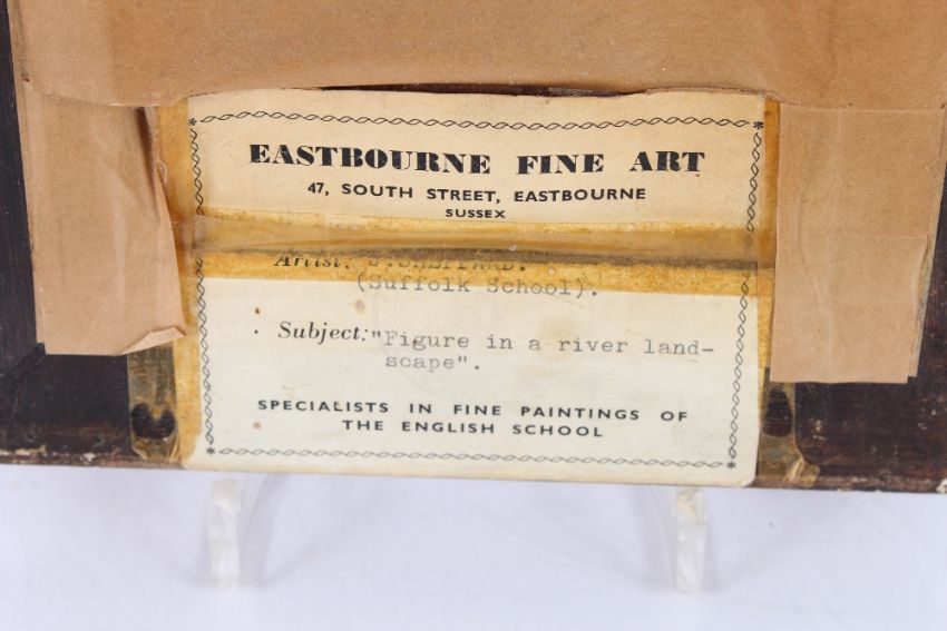 John Shepherd, pair of rural scenes depicting figure in a river landscape; and another of a woman walking in a wooded lane, unsigned oils on board, labels verso, 12cm x 10cm