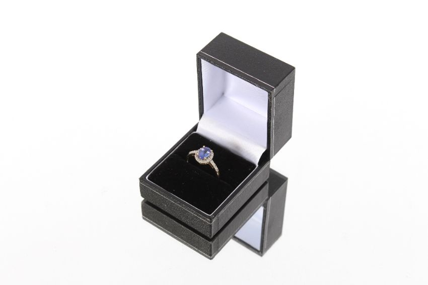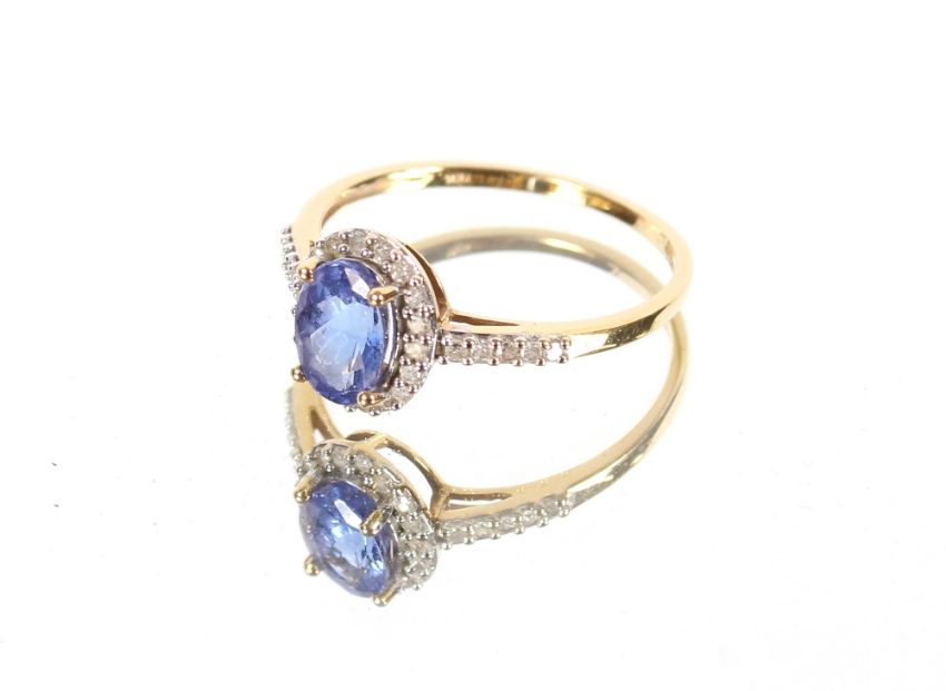 A 18ct gold tanzanite and diamond set ring, the oval tanzanite with brilliant cut diamond surround and diamond set shoulders, Hallmarked inside shank, ring size Q½