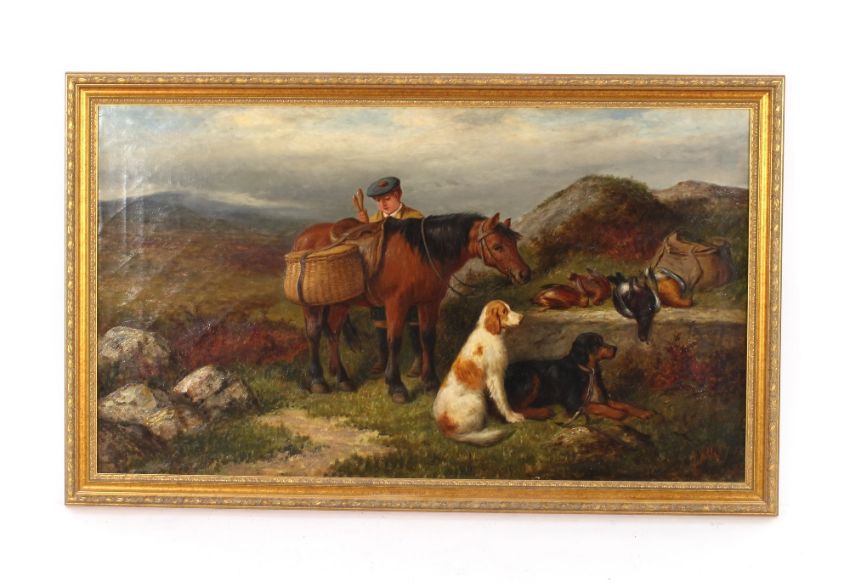 J. Noble, late 19th Century school, highland scene with huntsman, dogs and horse, "Returning With The Days Shoot", signed oil on canvas, 60cm x 107cm