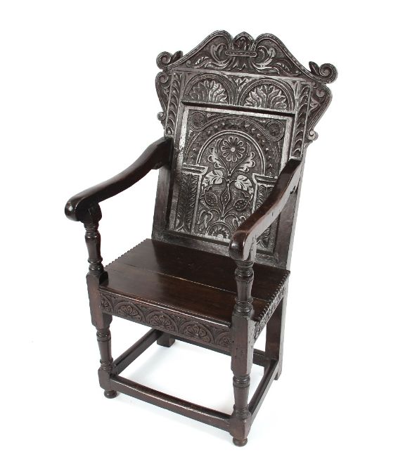 An 18th Century carved oak Wainscot chair having foliate decorated back panel above scroll arms and solid seat, raised on turned tapering supports united by stretchers