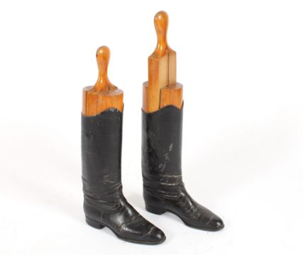 A pair of antique leather riding boots, complete with wooden boot trees