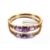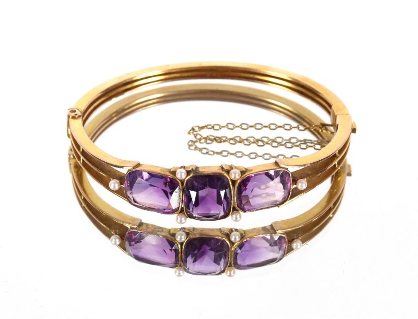 A Victorian unmarked gold bangle set three amethyst stones, flanked by seed pearls with safety chain in fitted box, approx. 20gms
