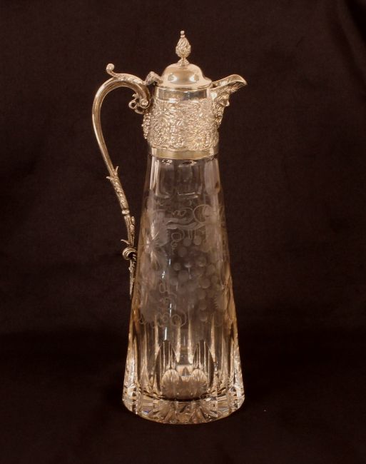 A heavy 20th Century cut crystal and silver mounted claret jug, the mount profusely decorated with vine leaves and Bacchus mask spout beneath a domed hinged lid with pineapple finial, foliate scroll handle, the body with etched vine decoration, 31cm high