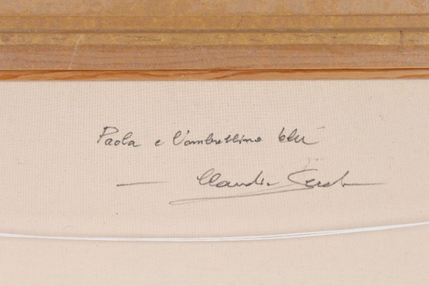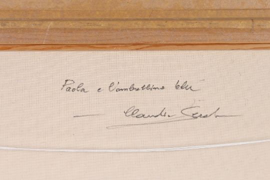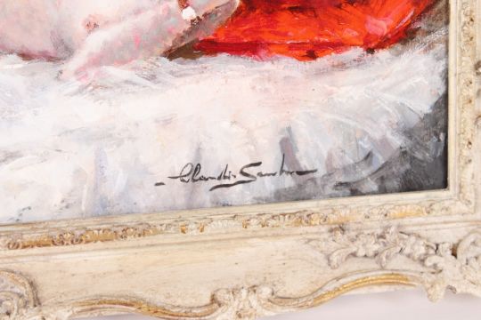 Jean Claude Saurel born 1947, "Paula And The Blue Umbrella" signed and inscribed verso in painted frame,46cm x 66cm