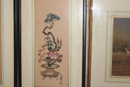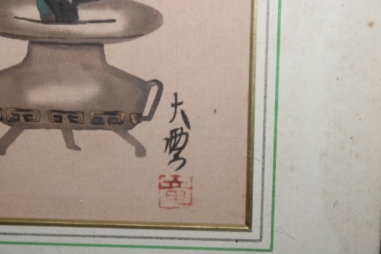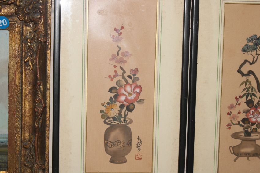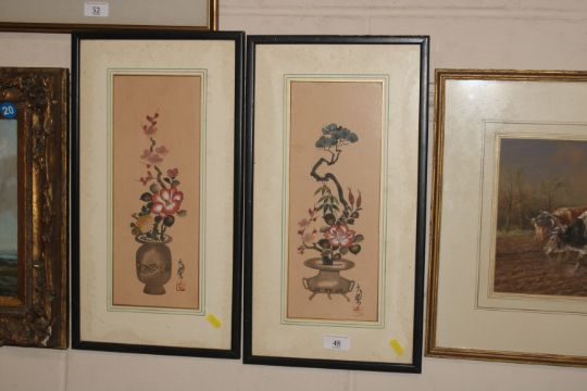 A pair of Oriental still life studies on fabric with character marks