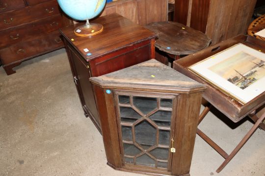 A 19th Century mahogany and astragal glazed corner cabinet; a mahogany music cabinet and an Edwardian centre table