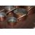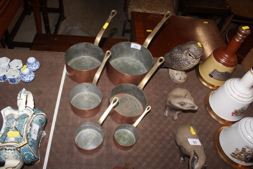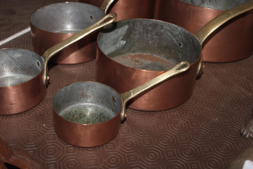 A graduated set of six copper and brass handled saucepans