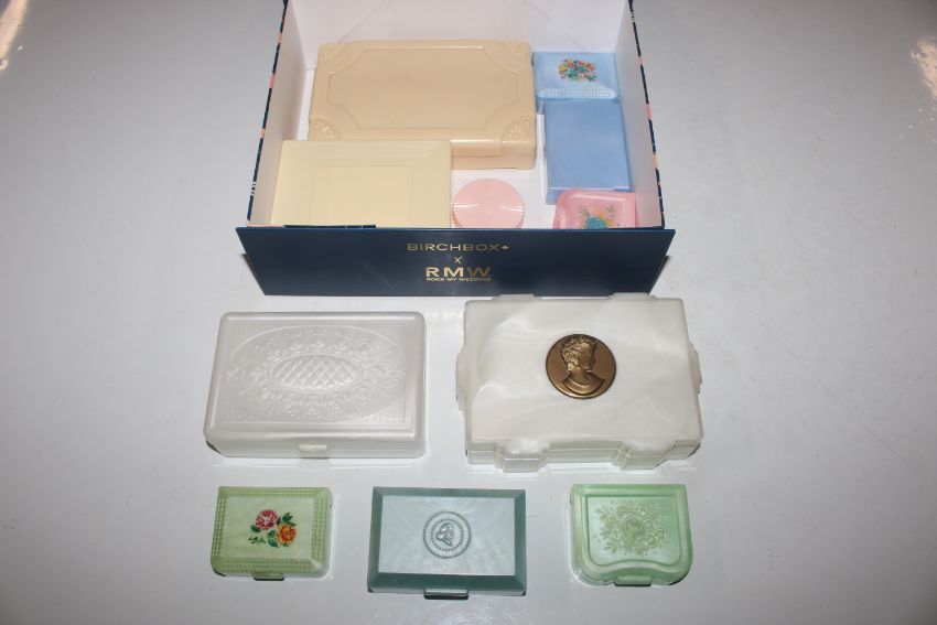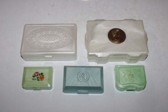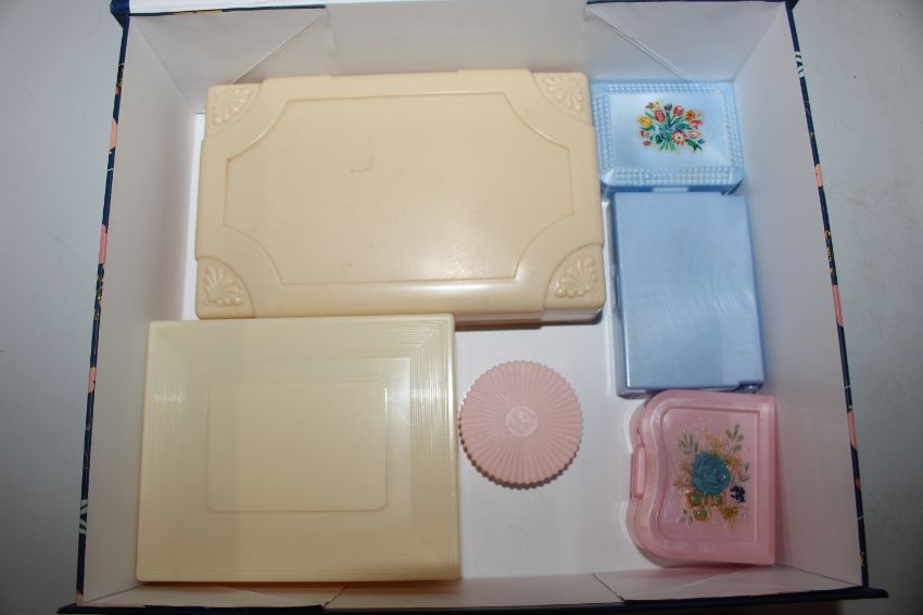 A box of vintage decorated plastic jewellery boxes