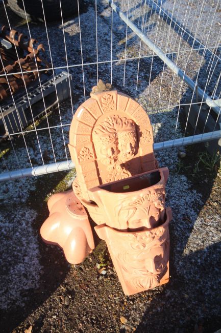 Two plastic wall mounting planters in the form of King and Queen, a similar plastic wall mounting plant trough etc