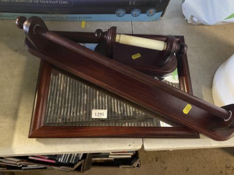 A wooden framed bathroom mirror, a similar toilet roll holder and a hand towel holder