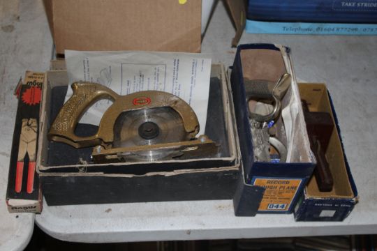A Wodan drill attachment circular saw in original box with instruction manuals, a Record No. 044 moulding plane with original box, a Marpels mortice gauge with original box and an Angus ceramic tile and glass cutter with original box