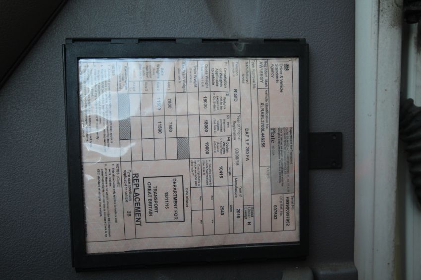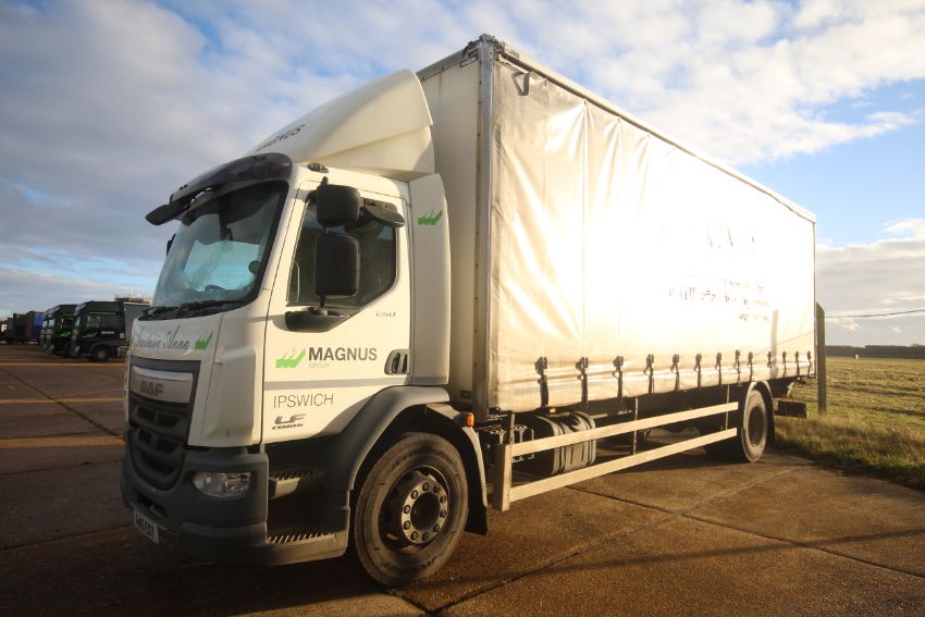 DAF LF 250 FA Euro 6 18T auto 4x2 rigid day cab. Registration AW15 EGY. Date of first registration 03/08/2015. MOT until 31/10/2024. 342,253km. Vehicle ID number XLRAEL3700L446255. 28ft curtain-side body with barn doors. DEL Tuckunder folding tail lift and rear camera. V RENDLESHAM