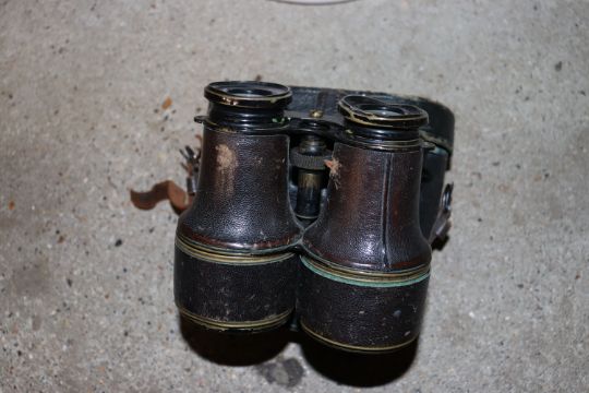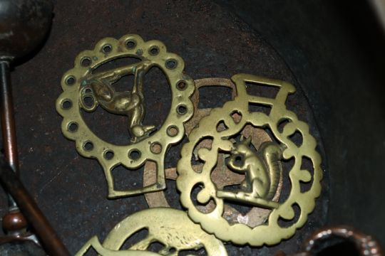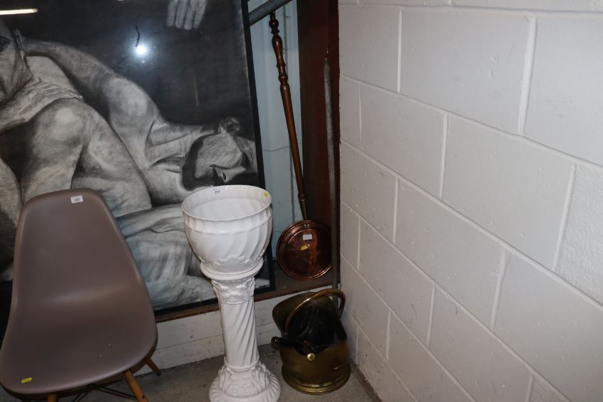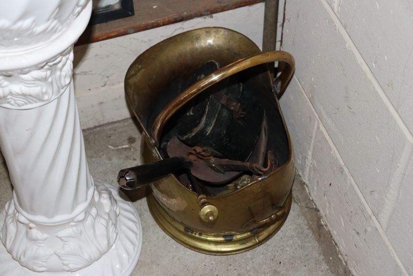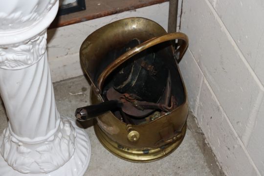 An antique copper warming pan with turned wooden handle; a copper coal scuttle; a pair of field glasses; fire implements etc.