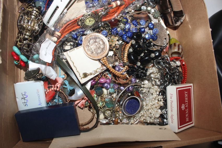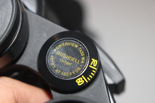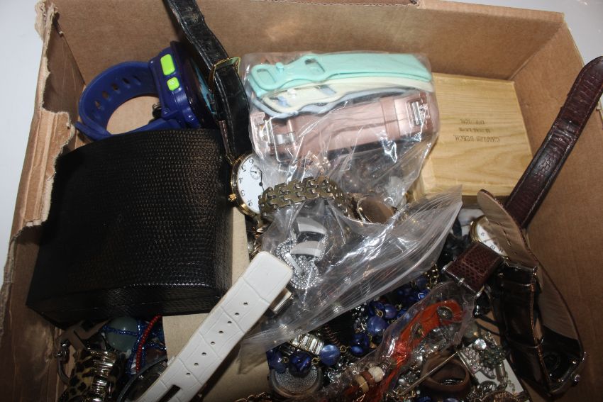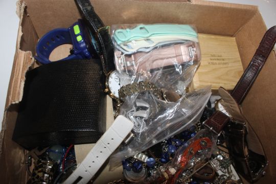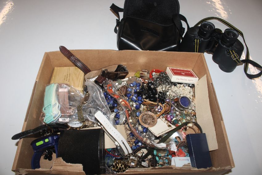 A pair of Bushnell binoculars and a box of various costume jewellery including wrist watches
