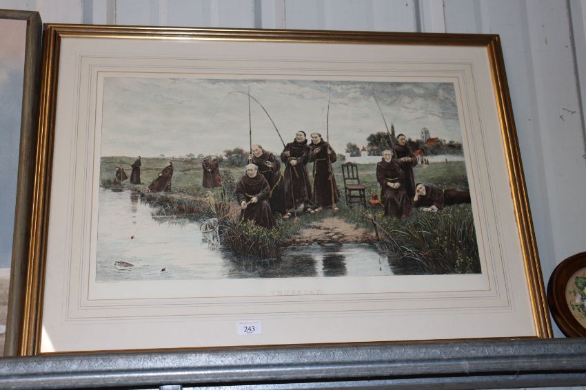A humorous coloured print after Dendy Saddler, depicting monks fishing entitled "Thursday"