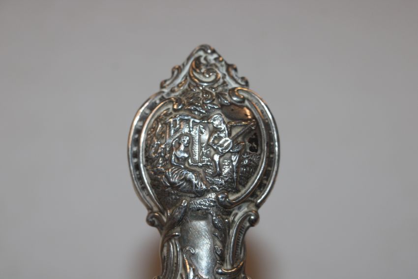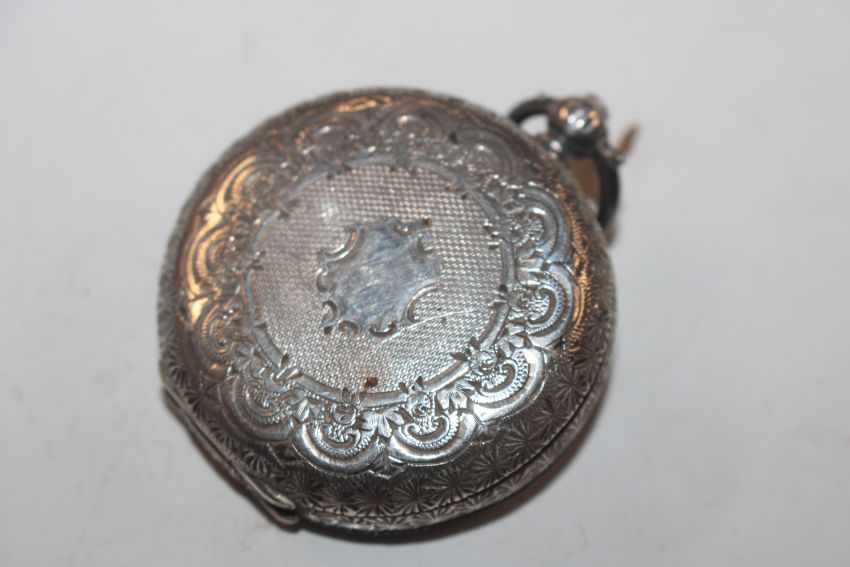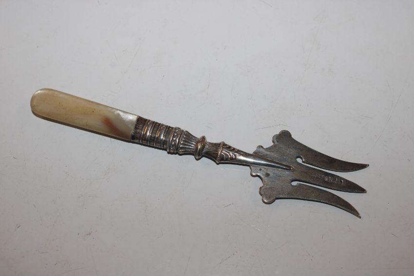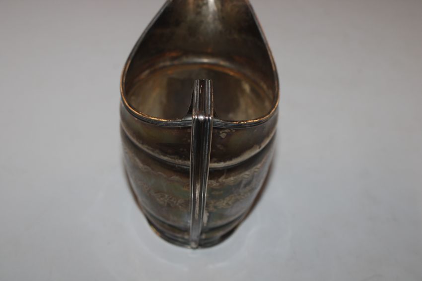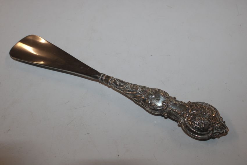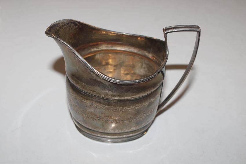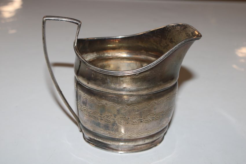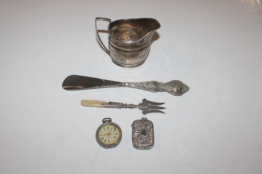 A silver cream jug, approx. 108gms; a vesta case; silver cased fob watch; a silver fork with mother of pearl handle and a silver handled shoe horn