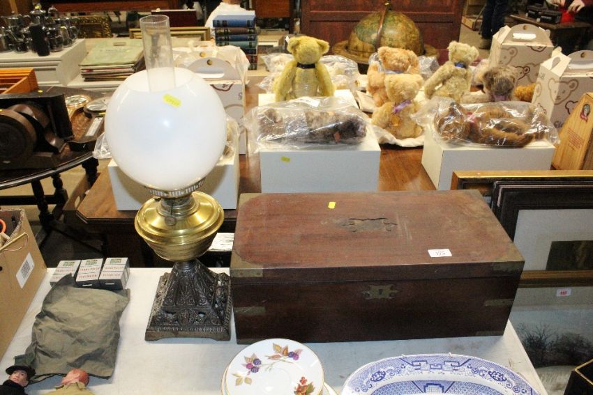 A Victorian mahogany writing box in need of restoration; and a brass oil lamp with cast iron base