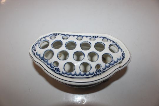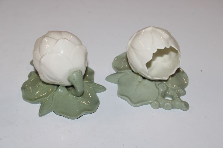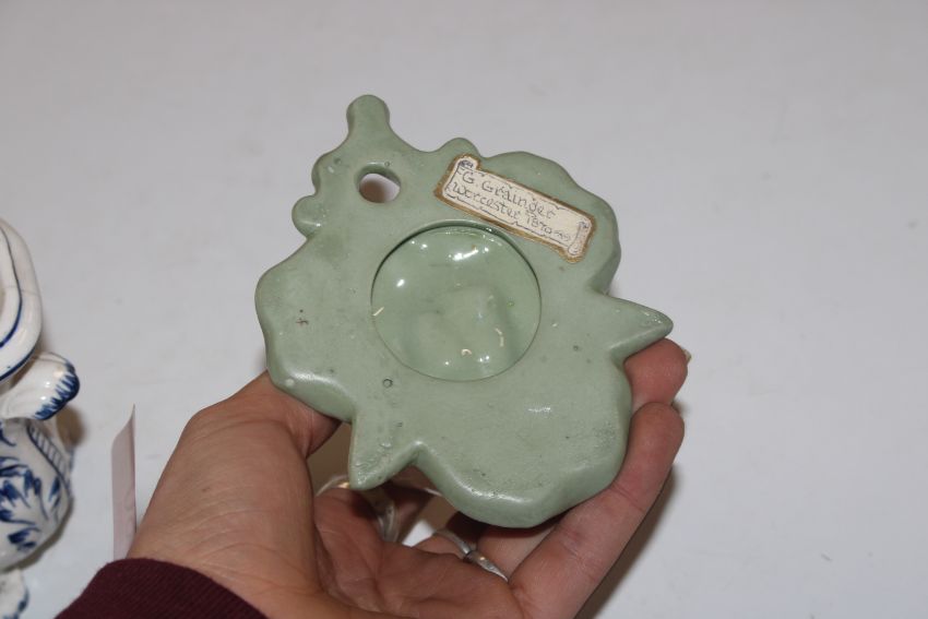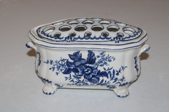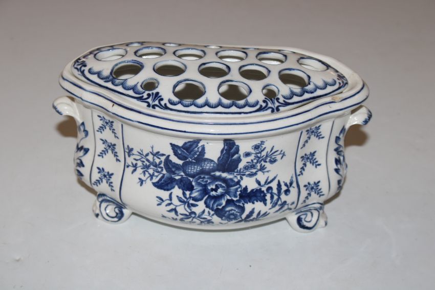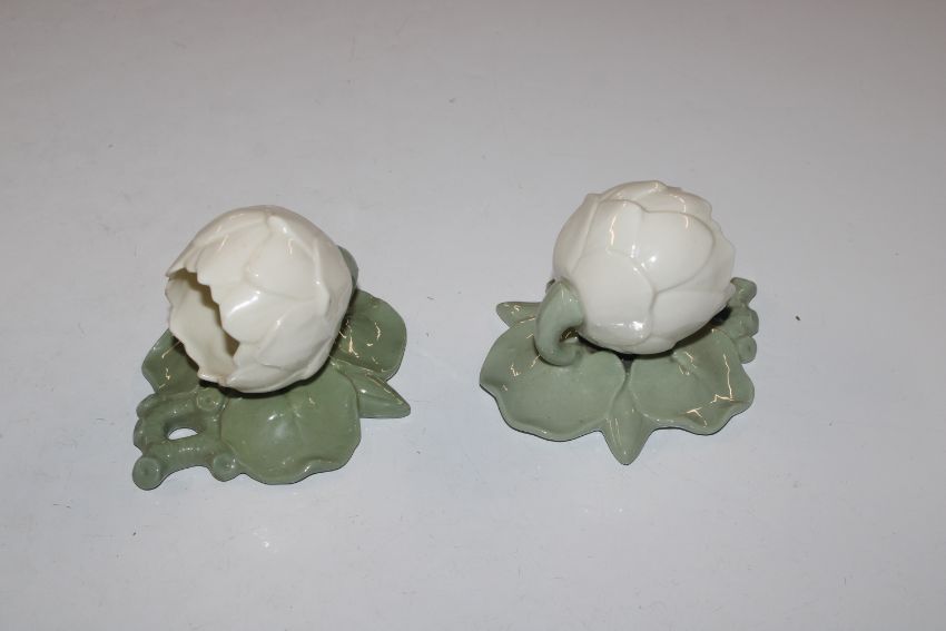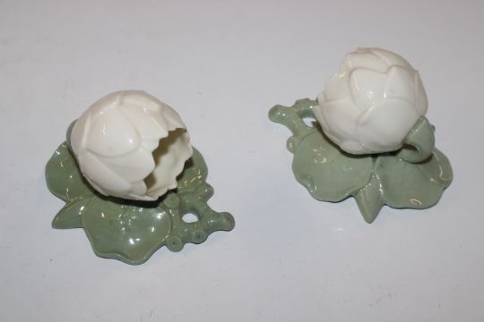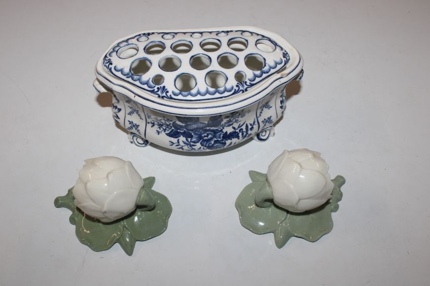 A pair of Worcester wall pockets in the form of flowers and a blue and white floral decorated posy vase AF