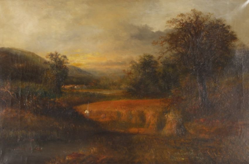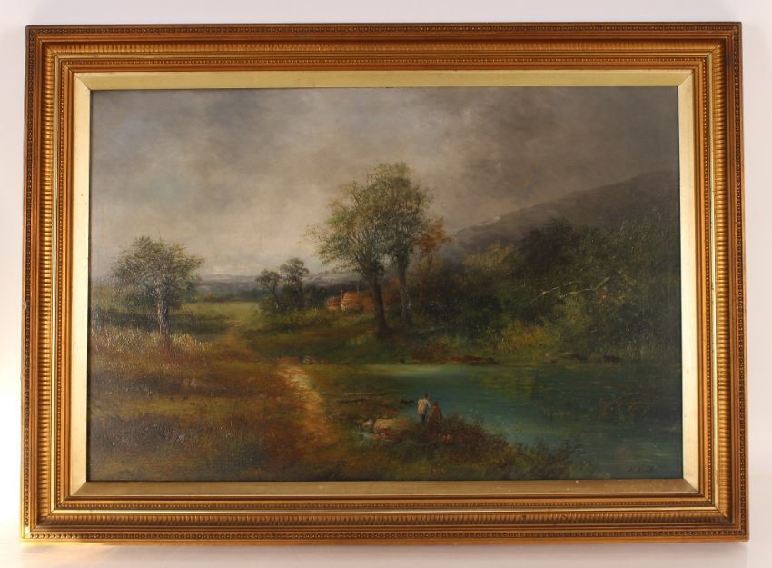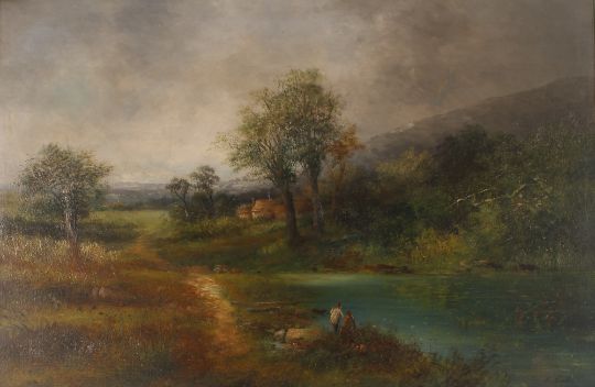 E. Neville, study of field workers and another study of figures by a river by the same hand, pair of oils on canvas, 50cm x 73cm