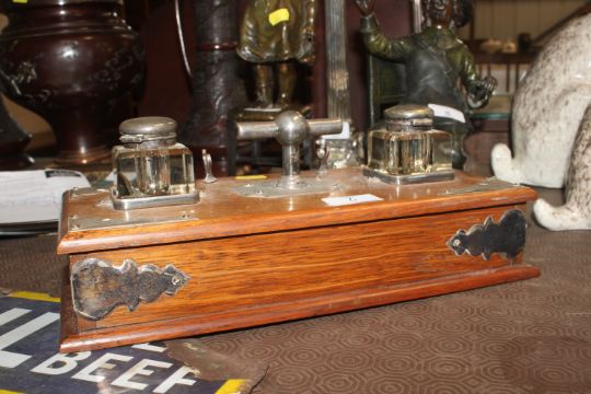 A Victorian golden oak desk stand, fitted pen rest, inkwells and single drawer
