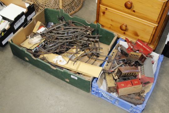 Two boxes containing tin plate model railway items and track