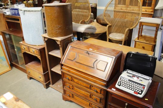 An oak bookcase, a bureau fitted three drawers and a linen box