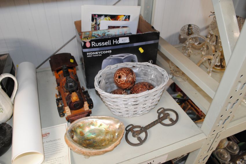 A model wooden train; an Abalone shell; a horses bit; books etc.