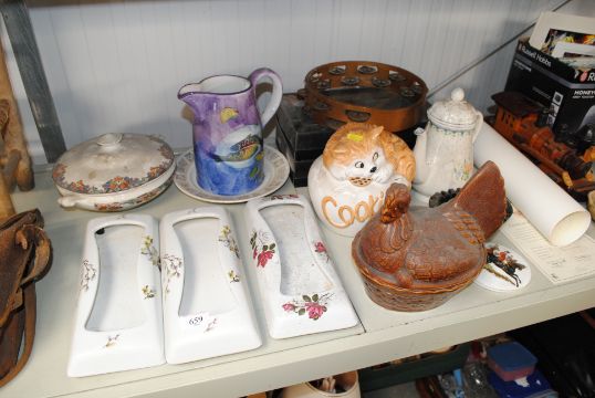 A collection of various pottery to include an egg crock, cat cookie jar, coffee pot, tambourine etc.