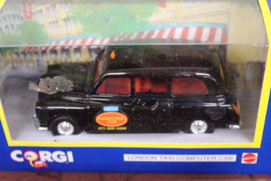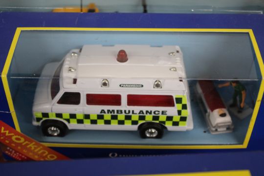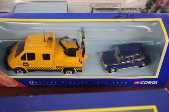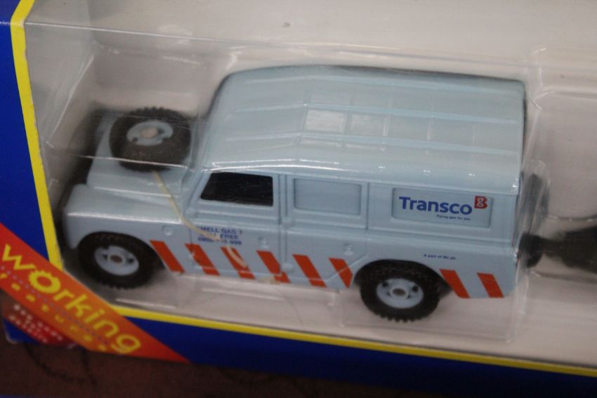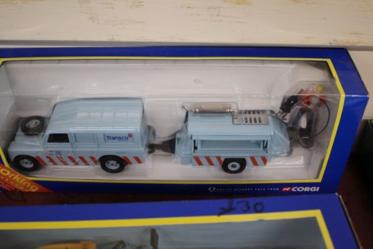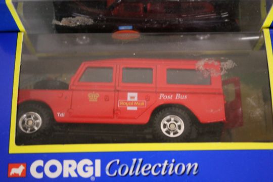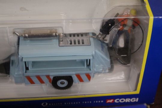 A Corgi 60015 road recovery set; 60031 Land Rover road drill and figure Transco set; 57302 Chevrolet ambulance and stretcher bearer; a Corgi Land Rover Royal Mail post bus 57902; London taxi computer cab; and various others including a boxed set of four Natural Resources vans
