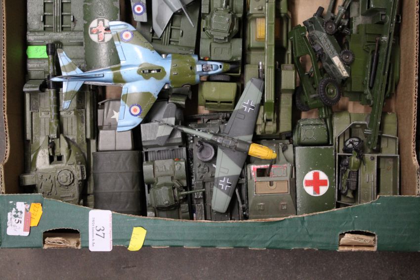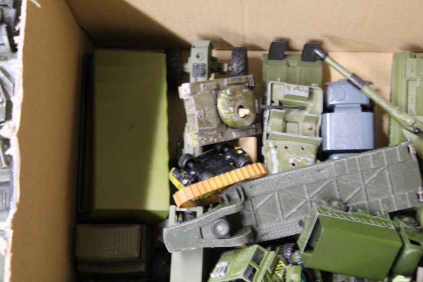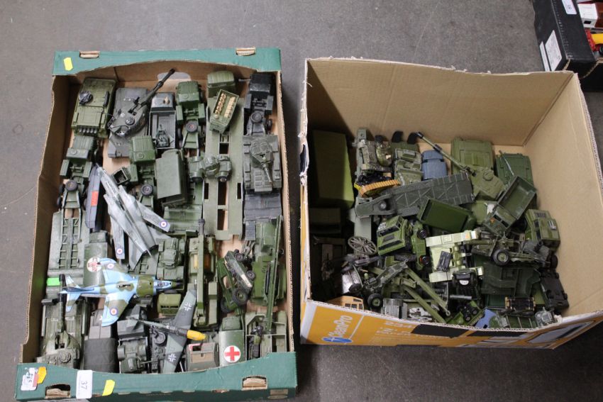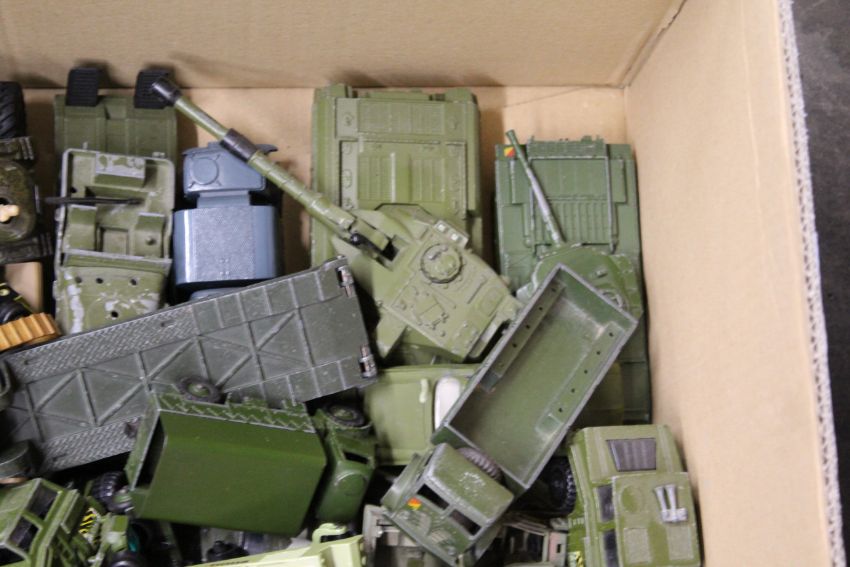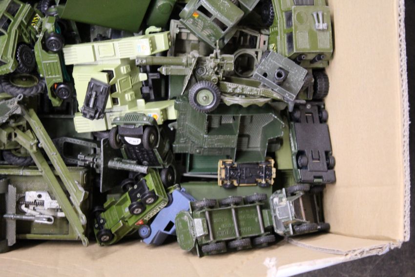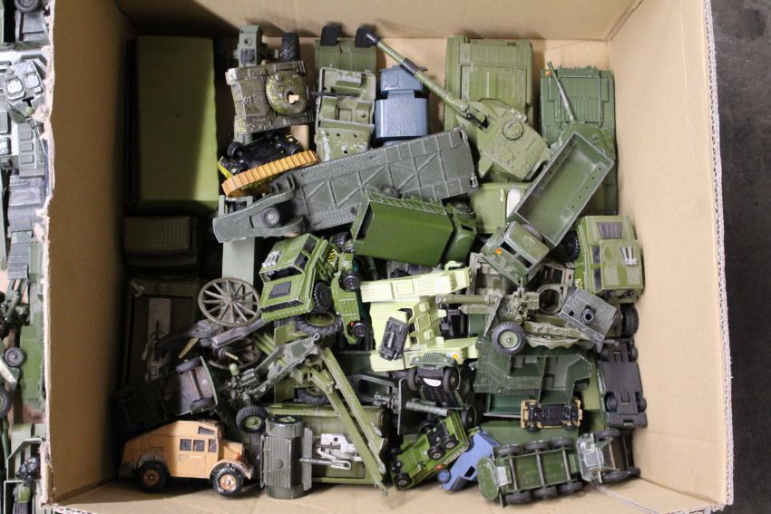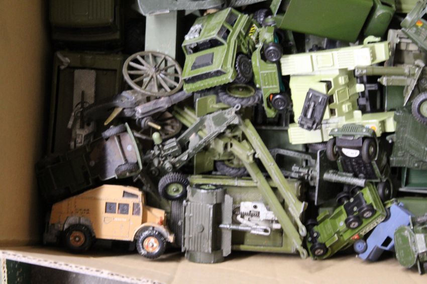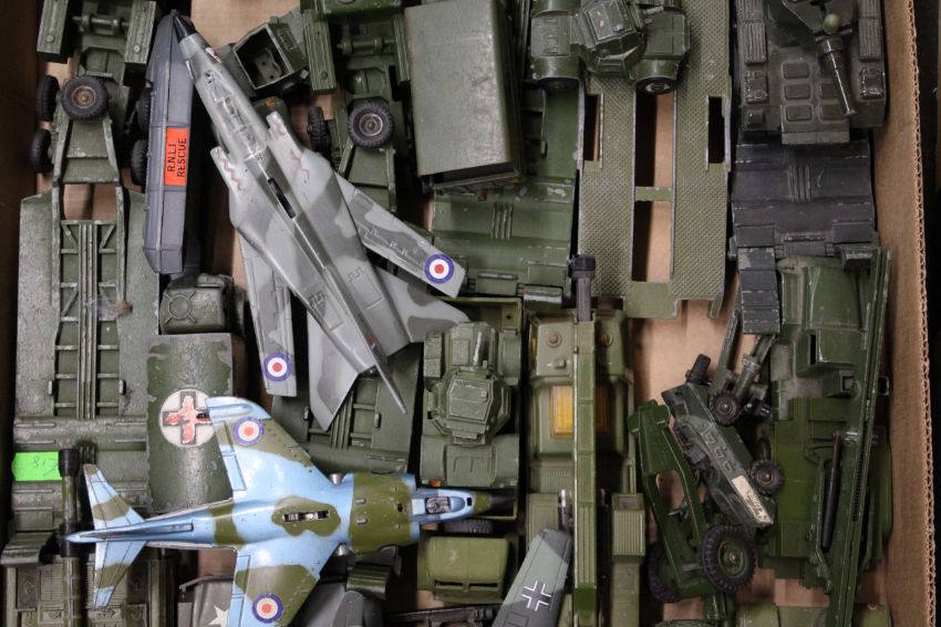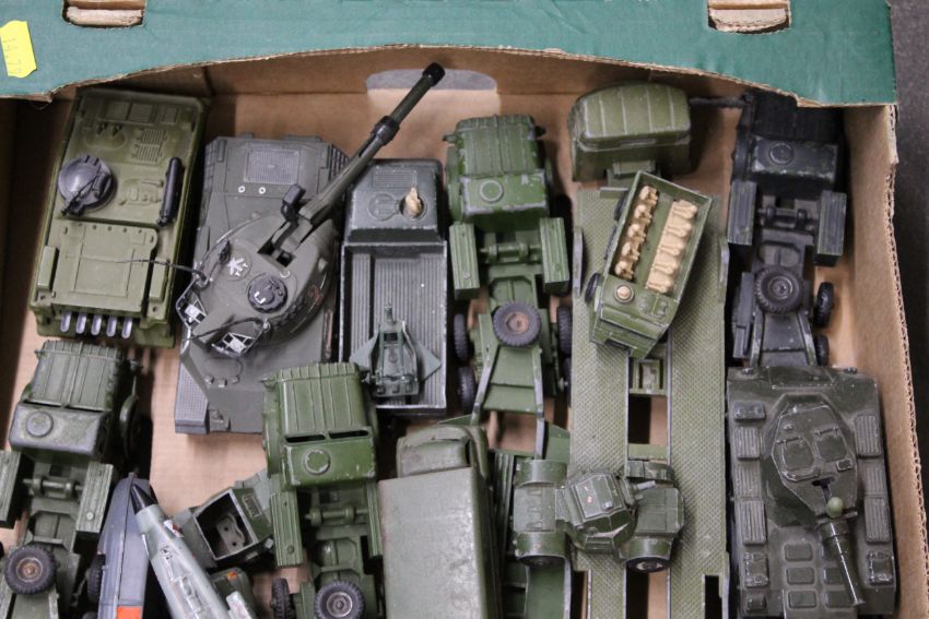 A large collection of unboxed Dinky and others military vehicles including tanks and transporters, aeroplanes, field guns, mostly play worn