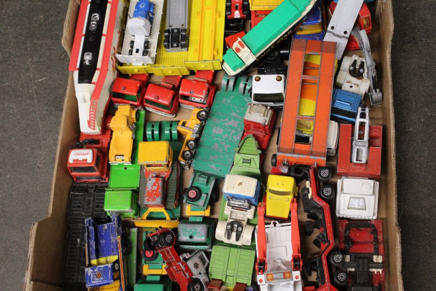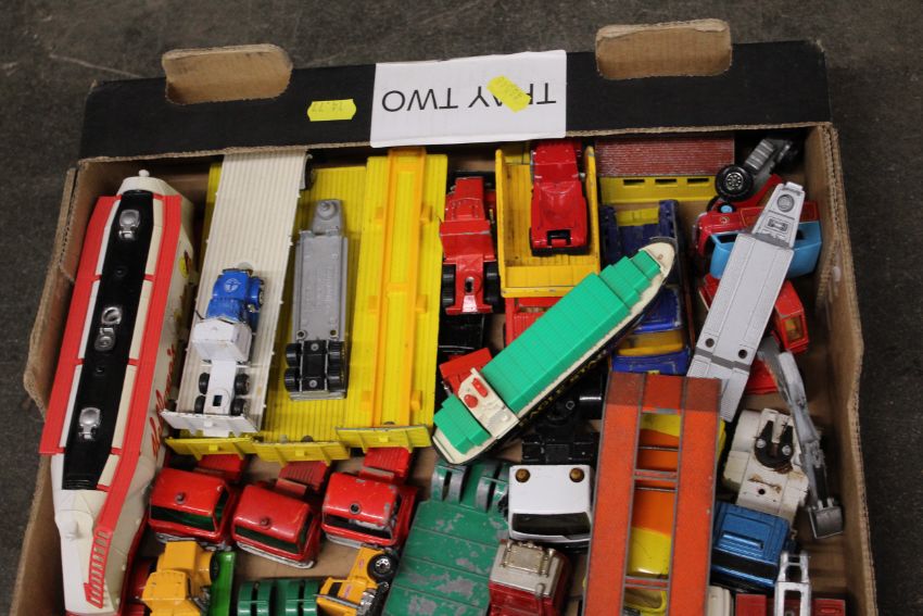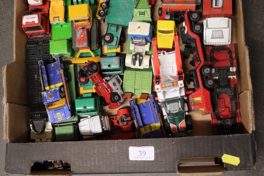 A collection of mostly die-cast Matchbox and other play worn vehicles, mostly haulage related, unboxed