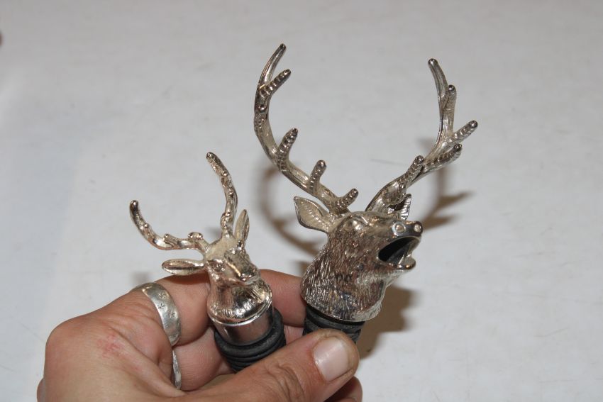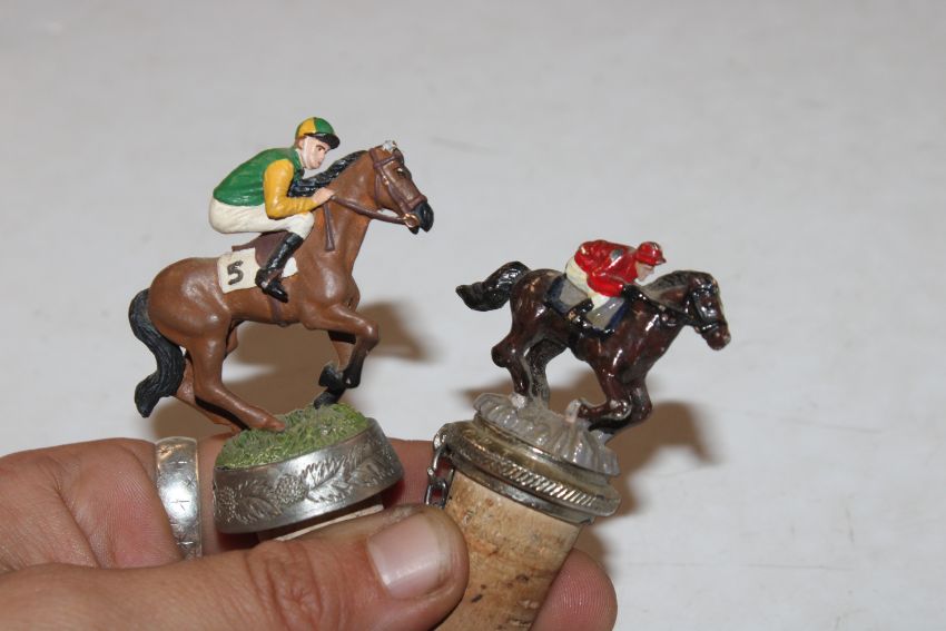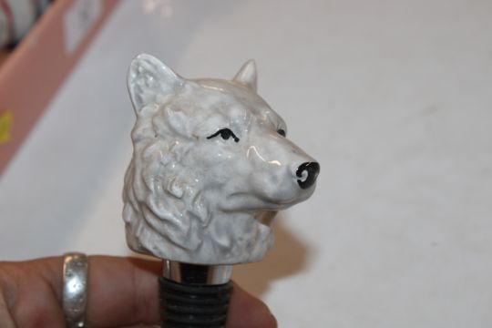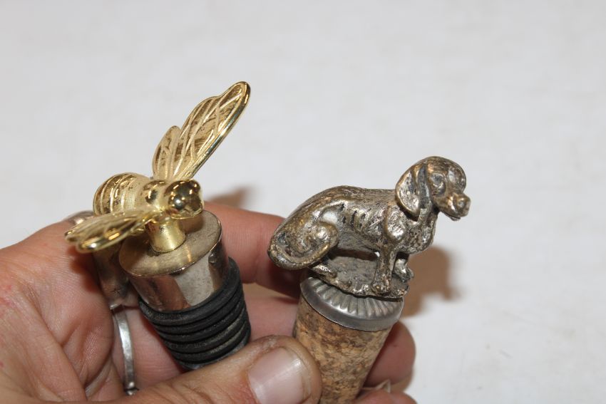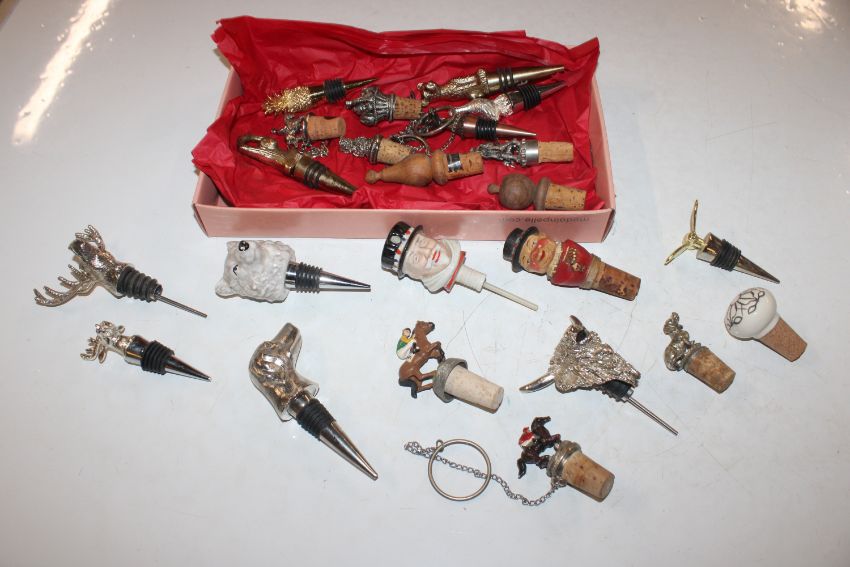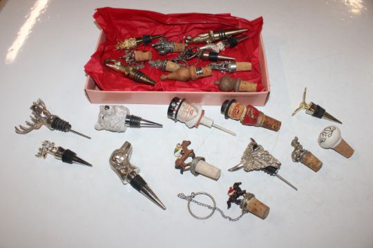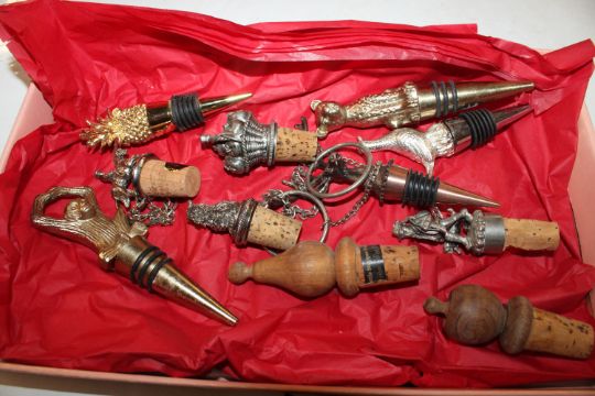 A box containing various novelty and other bottle stoppers