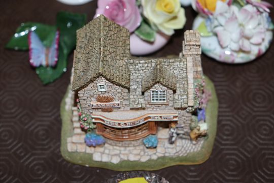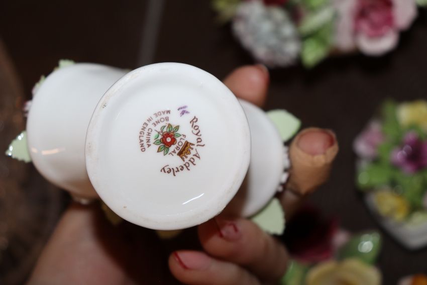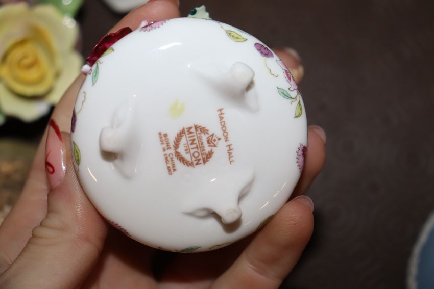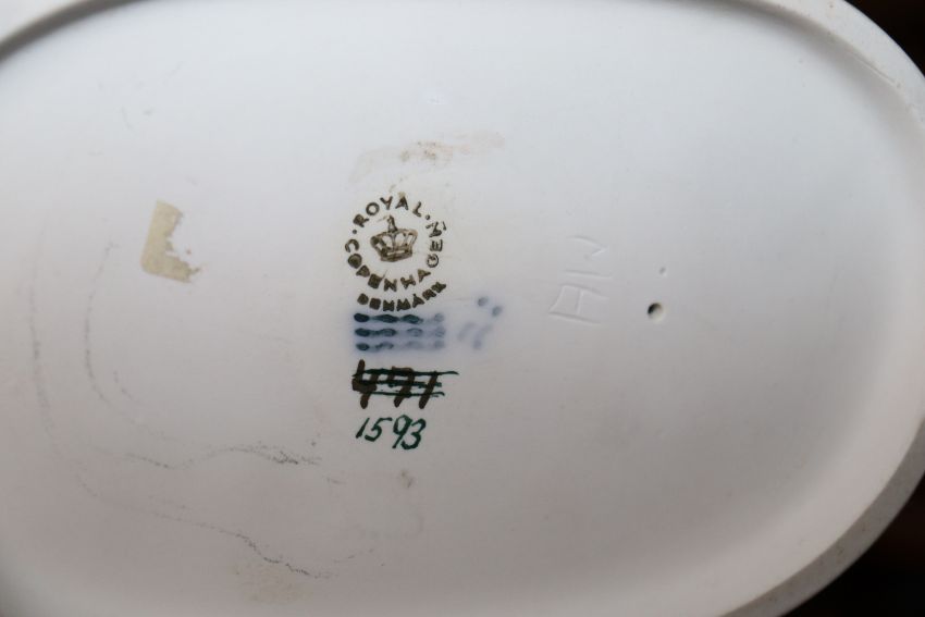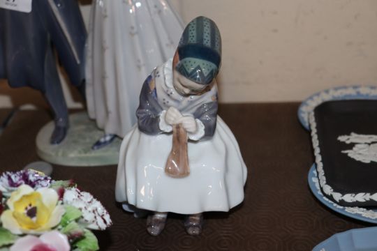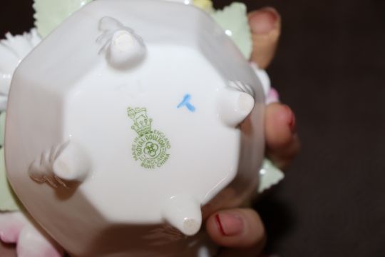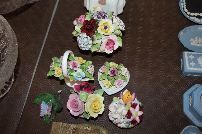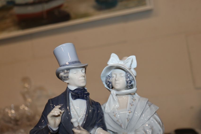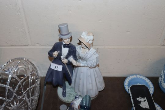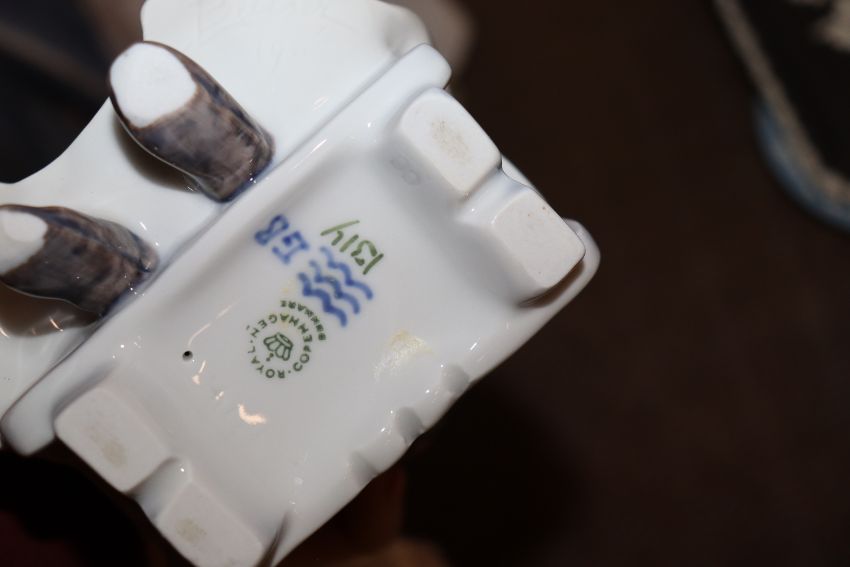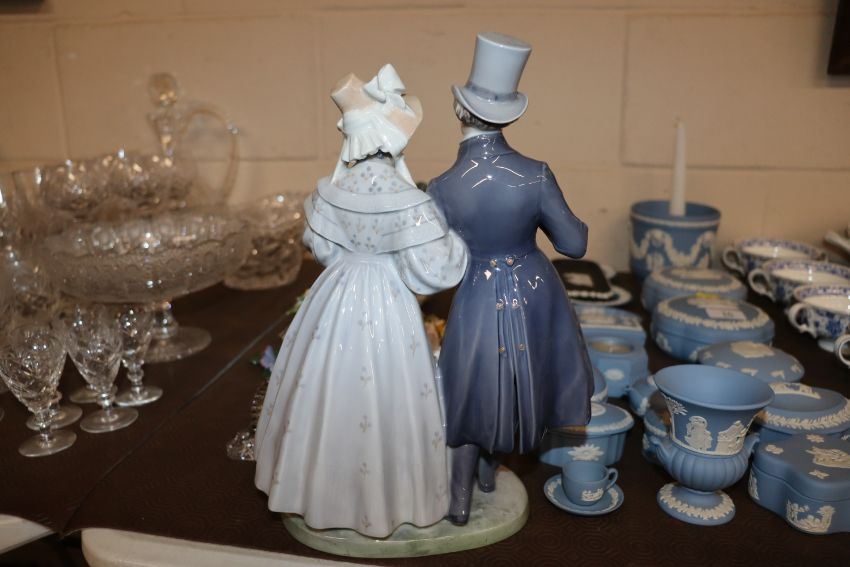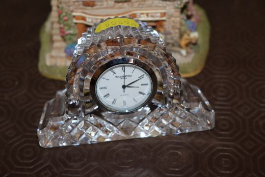 A Waterford crystal mantle time piece and various floral encrusted ornaments, Royal Copenhagen figure groups