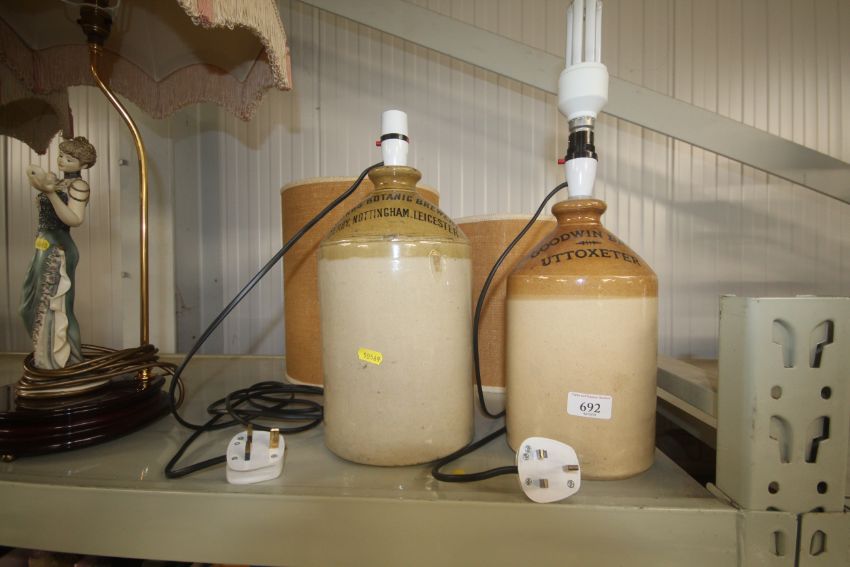 Two stoneware bottles converted to table lamps with shades