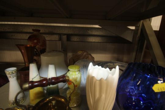 A collection of glass lightshades, blue & white meat plates, various vases and brassware etc