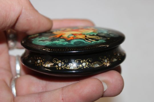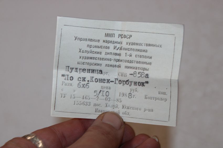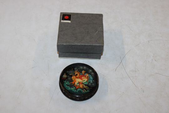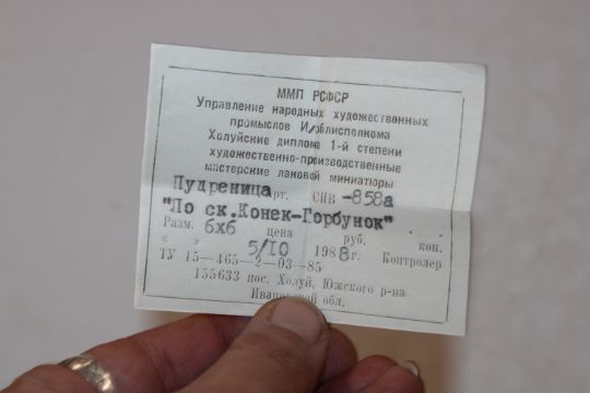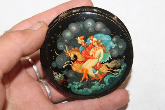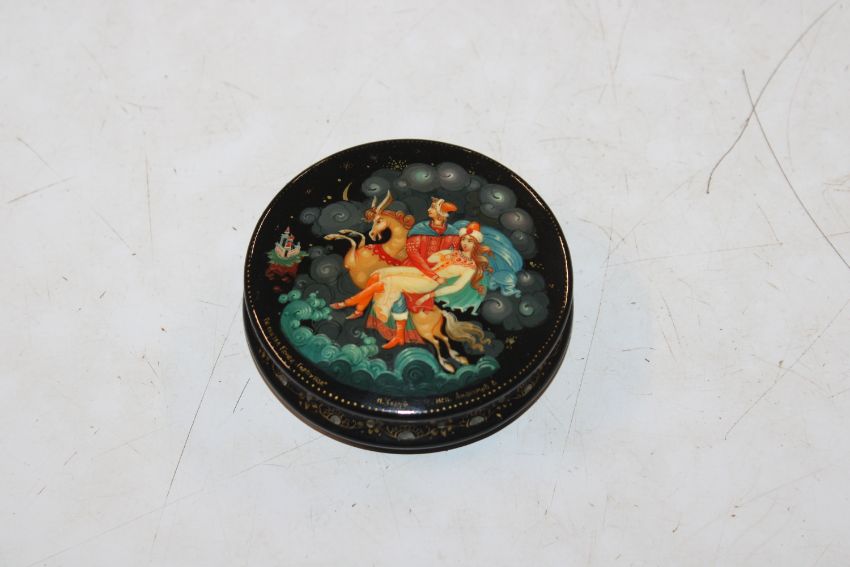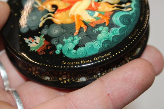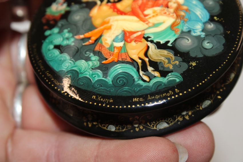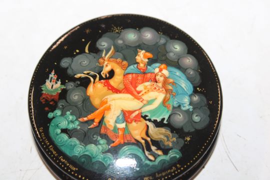 V. Anfimov, Kholui Russian lacquered box entitled "According To The Fairy Tale, The Hump Back Horse" label dated 5th October 1988