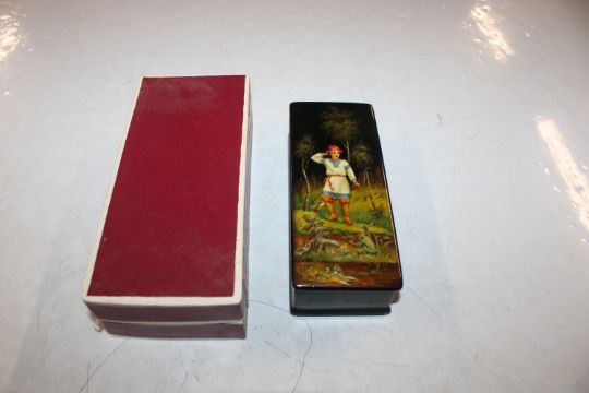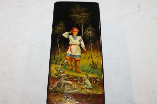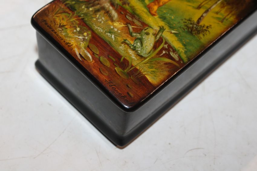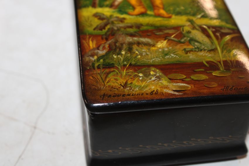 Fedoskino Russian lacquered box possibly by Ivanova dated '88 entitled "Frog Princess" depicting "Prince Ivan and The Frog Princess"