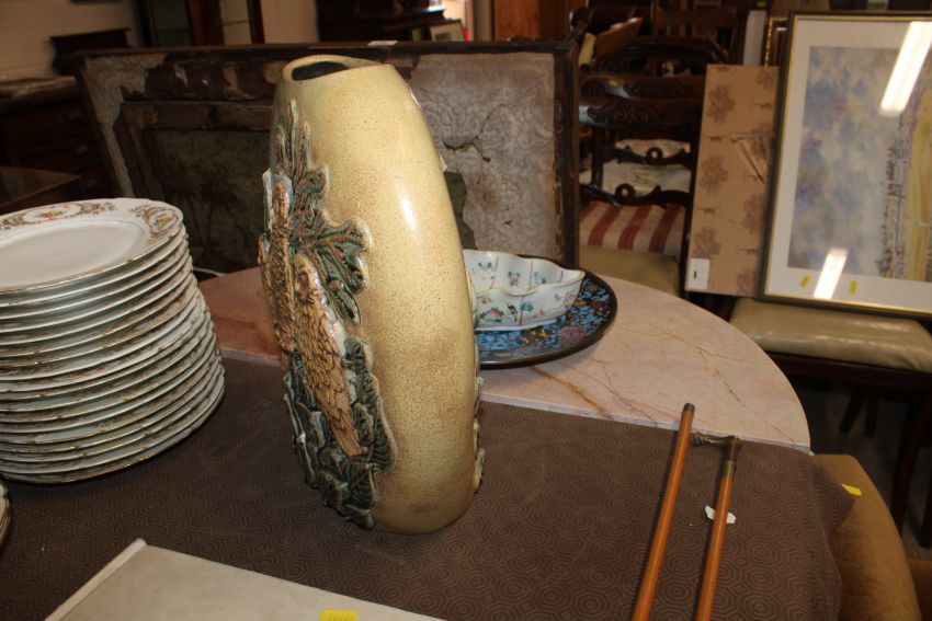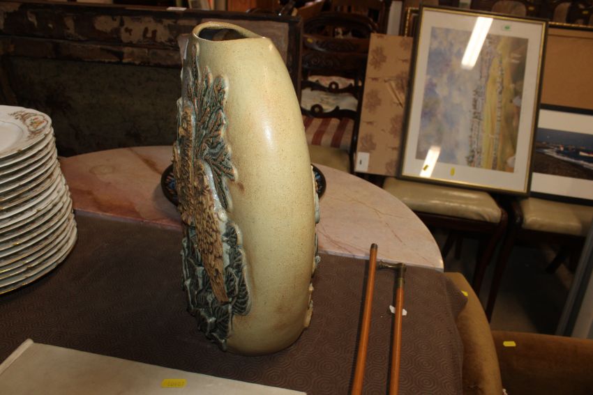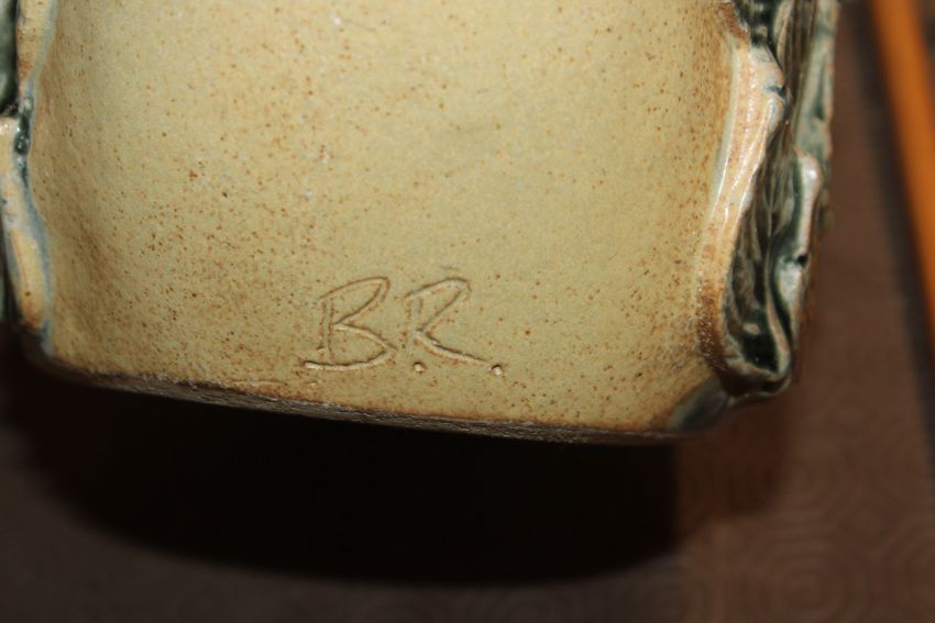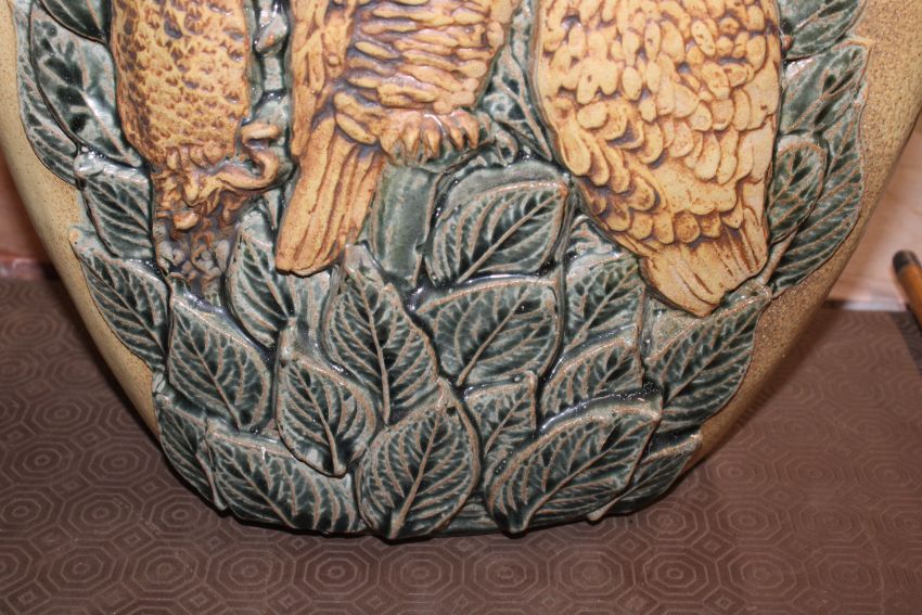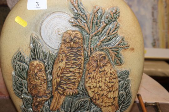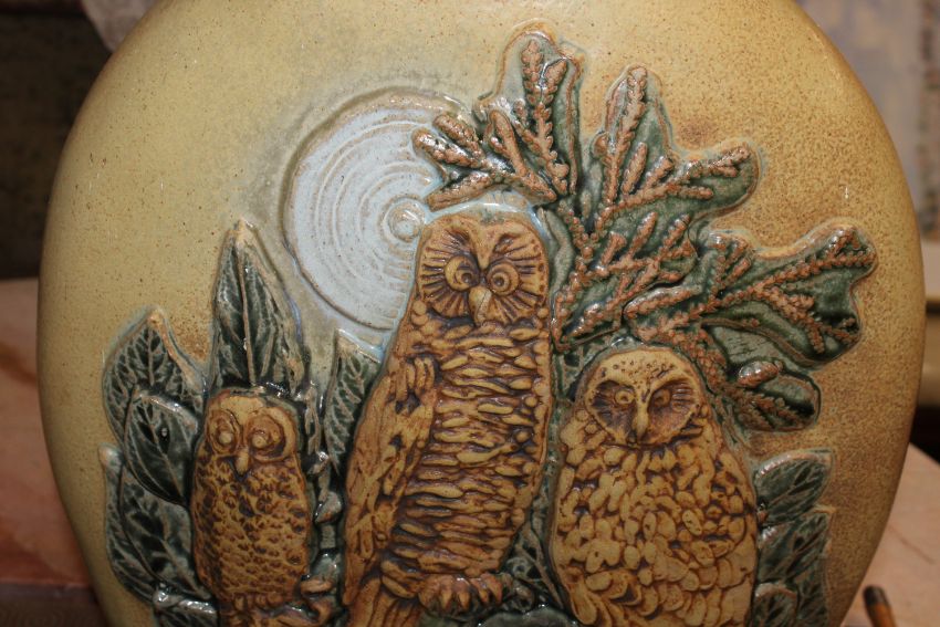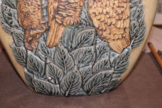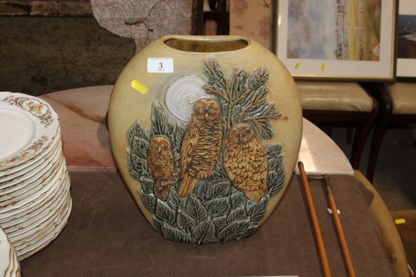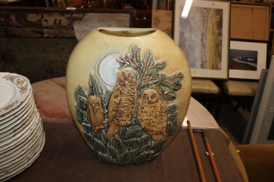 A Bernard Rooke pottery vase decorated with owls amongst foliage initialled to base